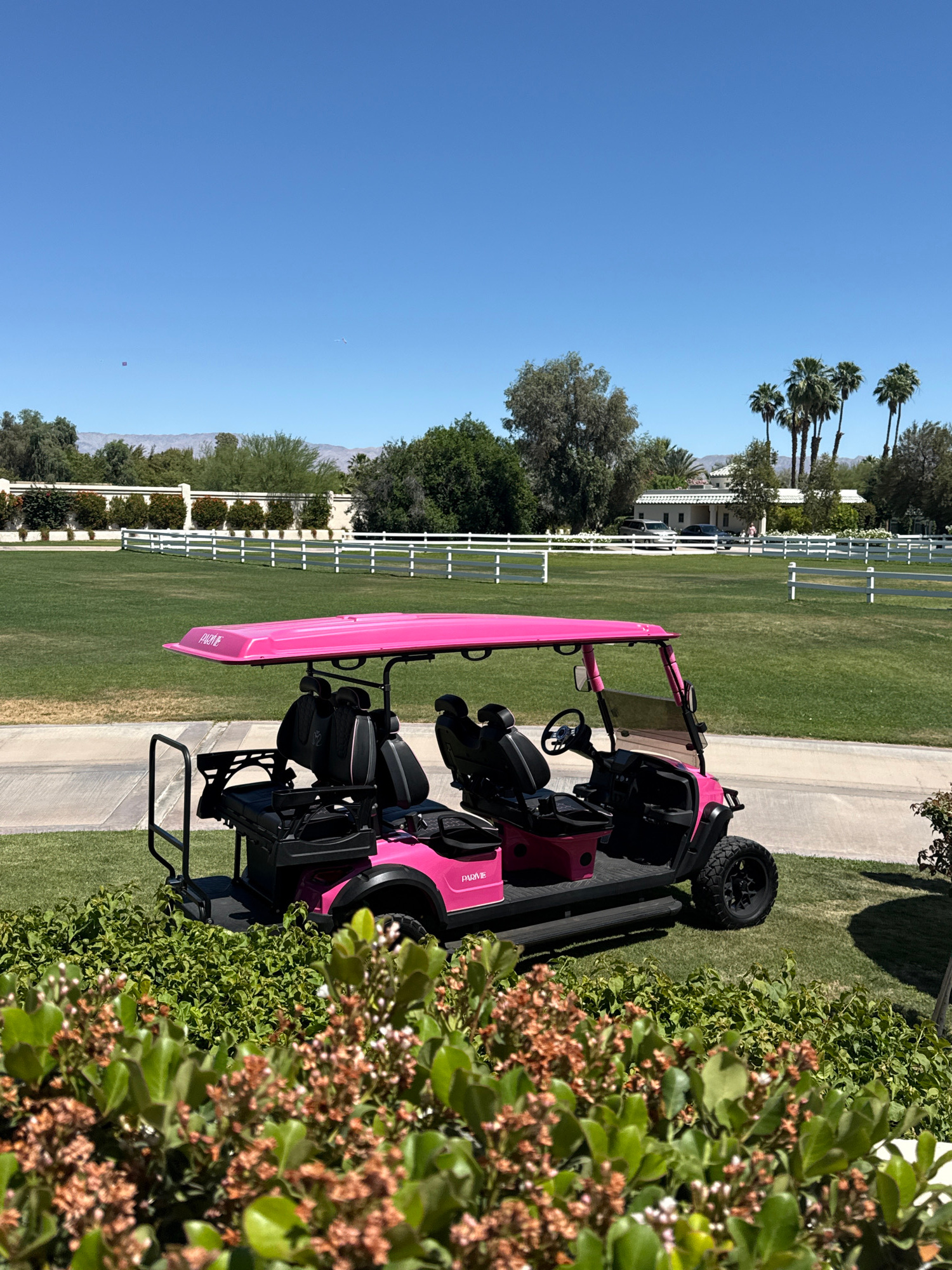 A pink golf cart with black seating is parked on a concrete path alongside green grass and a trimmed green bush in an outdoor setting. In the background is a white wooden fence and palm trees are visi…read more