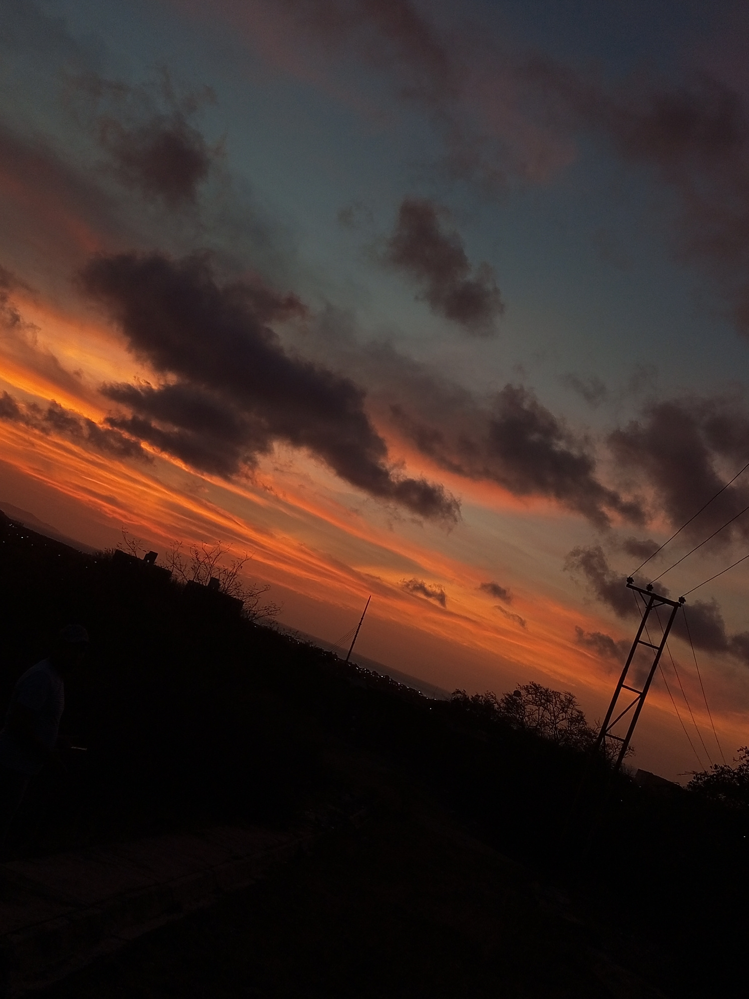 A long-angle shot captures a vivid sunset with orange and pink hues streaking across the sky, interspersed with dark, grey clouds. In the foreground, a silhouette of dark ground covers the lower porti…read more