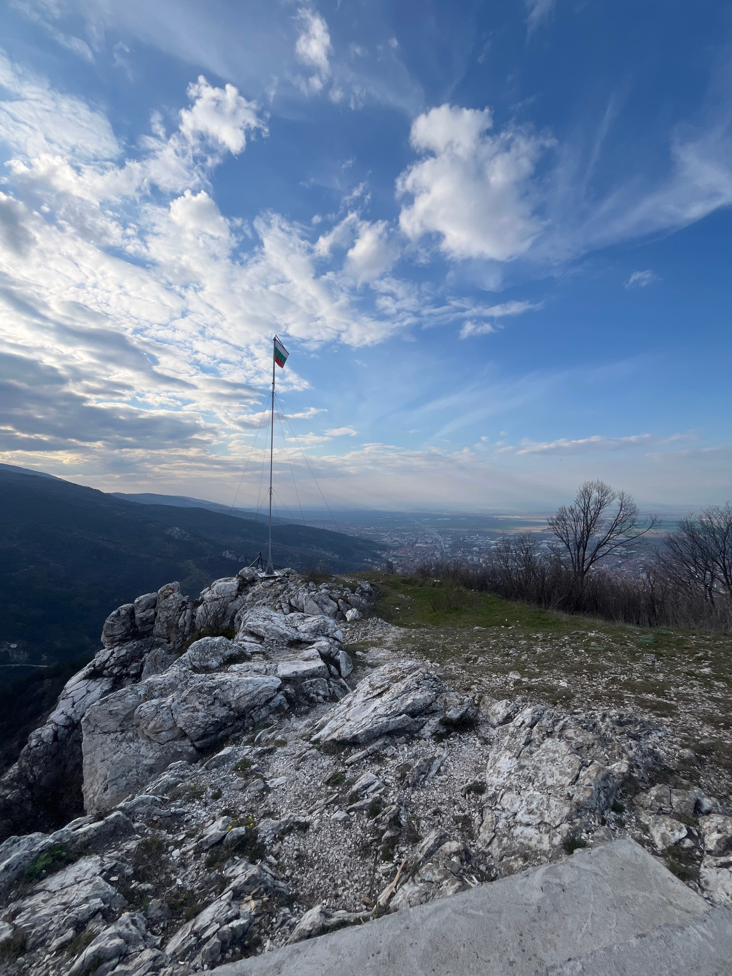 The image depicts a high-altitude rocky outcrop overlooking the city of Asenovgrad, Bulgaria. In the foreground, a prominent, light-grey rock formation dominates the scene, composed of large, fracture…read more