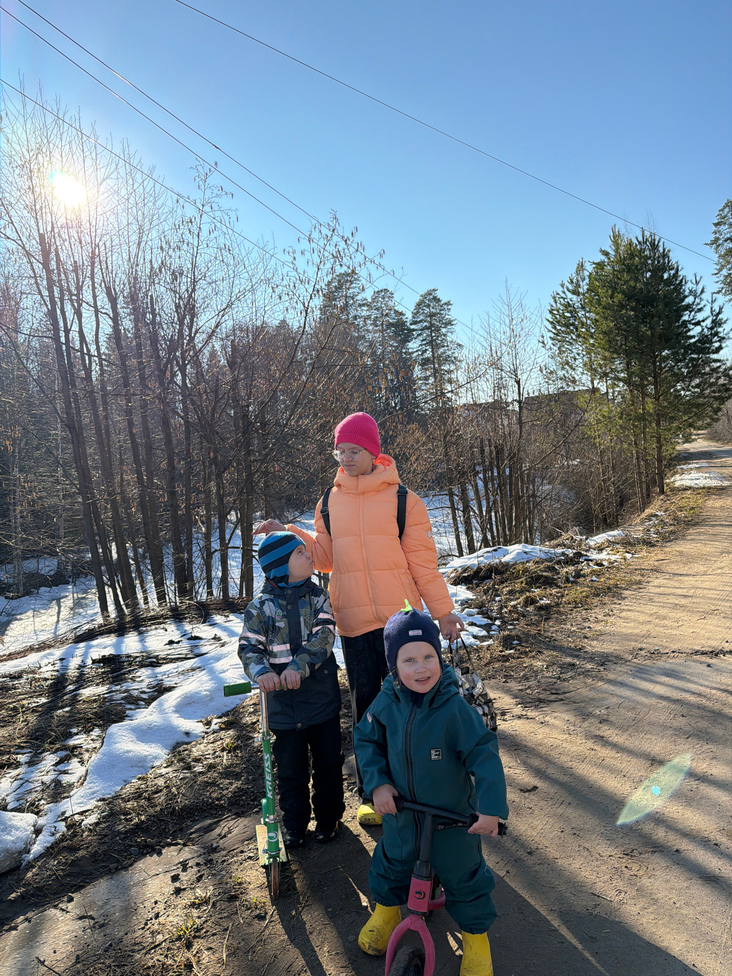 Three children are outdoors on a dirt and snow-covered path, in what appears to be a forest or park area on a sunny day. The path is partially covered in snow, and there are trees in the background. T…read more