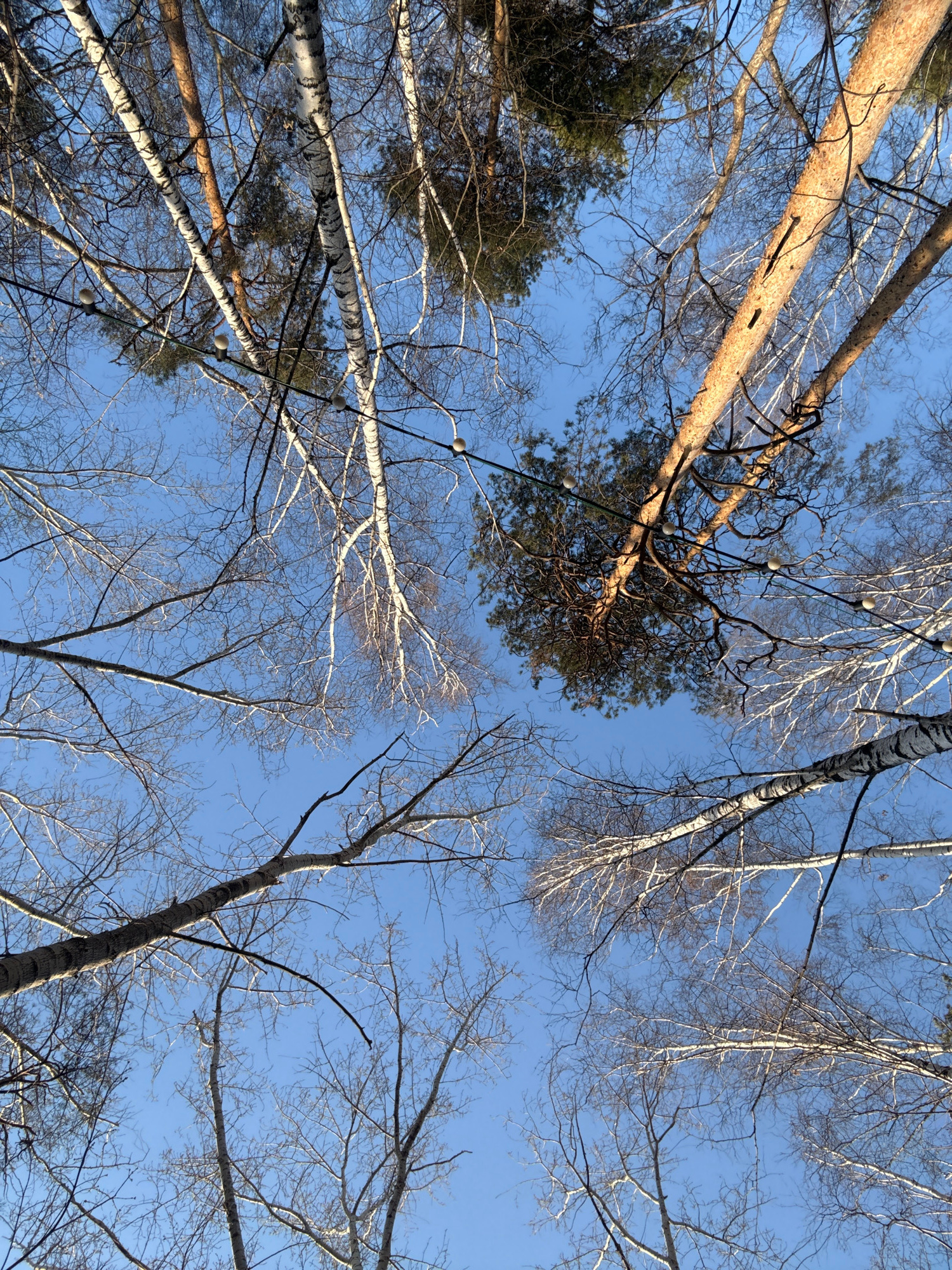 The image depicts a view looking up through a dense canopy of trees against a clear, blue sky. Several tree species are visible, including birch trees characterized by their white bark and thinner bra…read more
