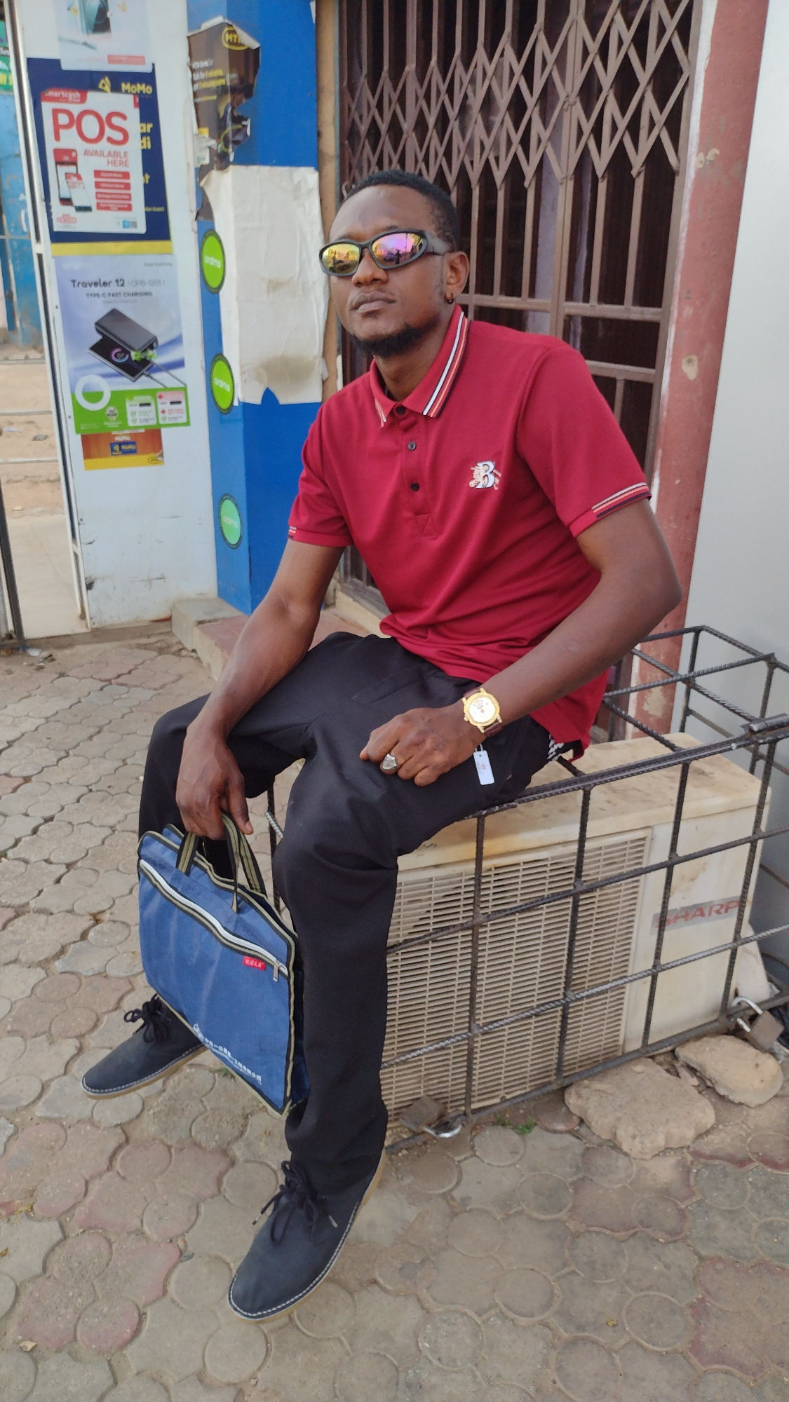 A man stands on a paved area. He wears a red polo shirt with a small white emblem on the chest, black pants, and black shoes. He also has sunglasses on and a gold watch on his left wrist. He is holdin…read more