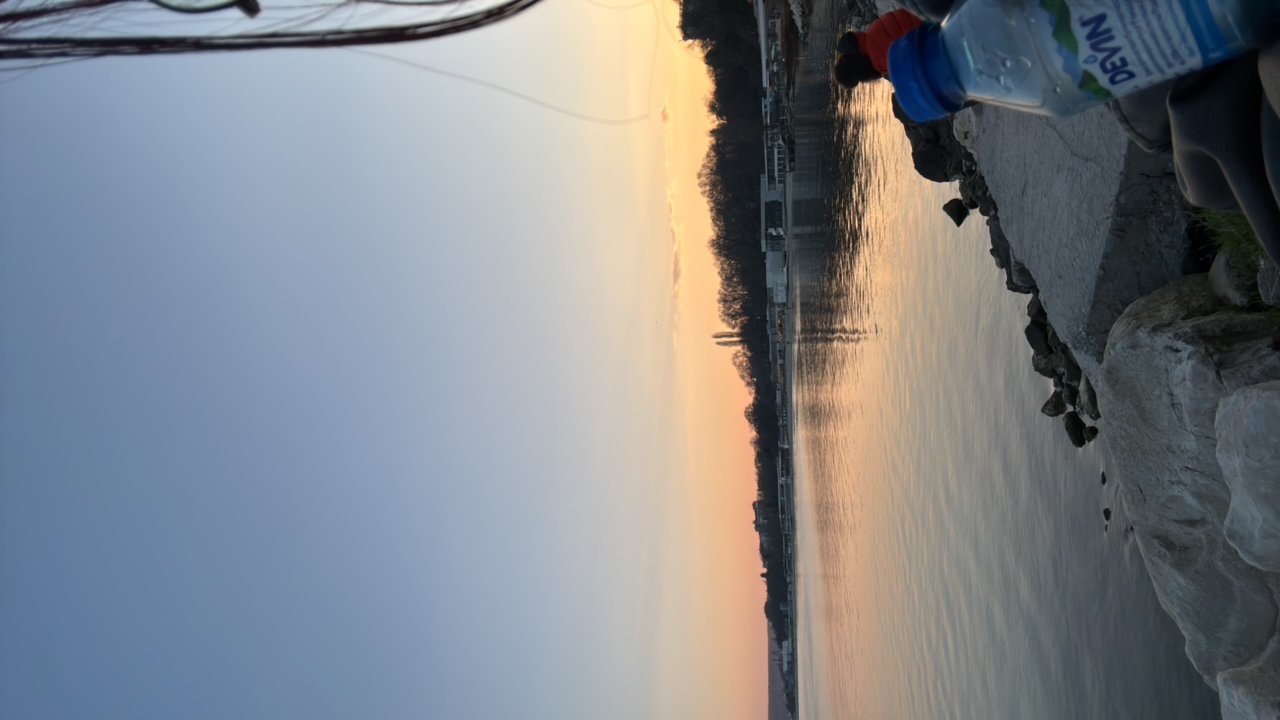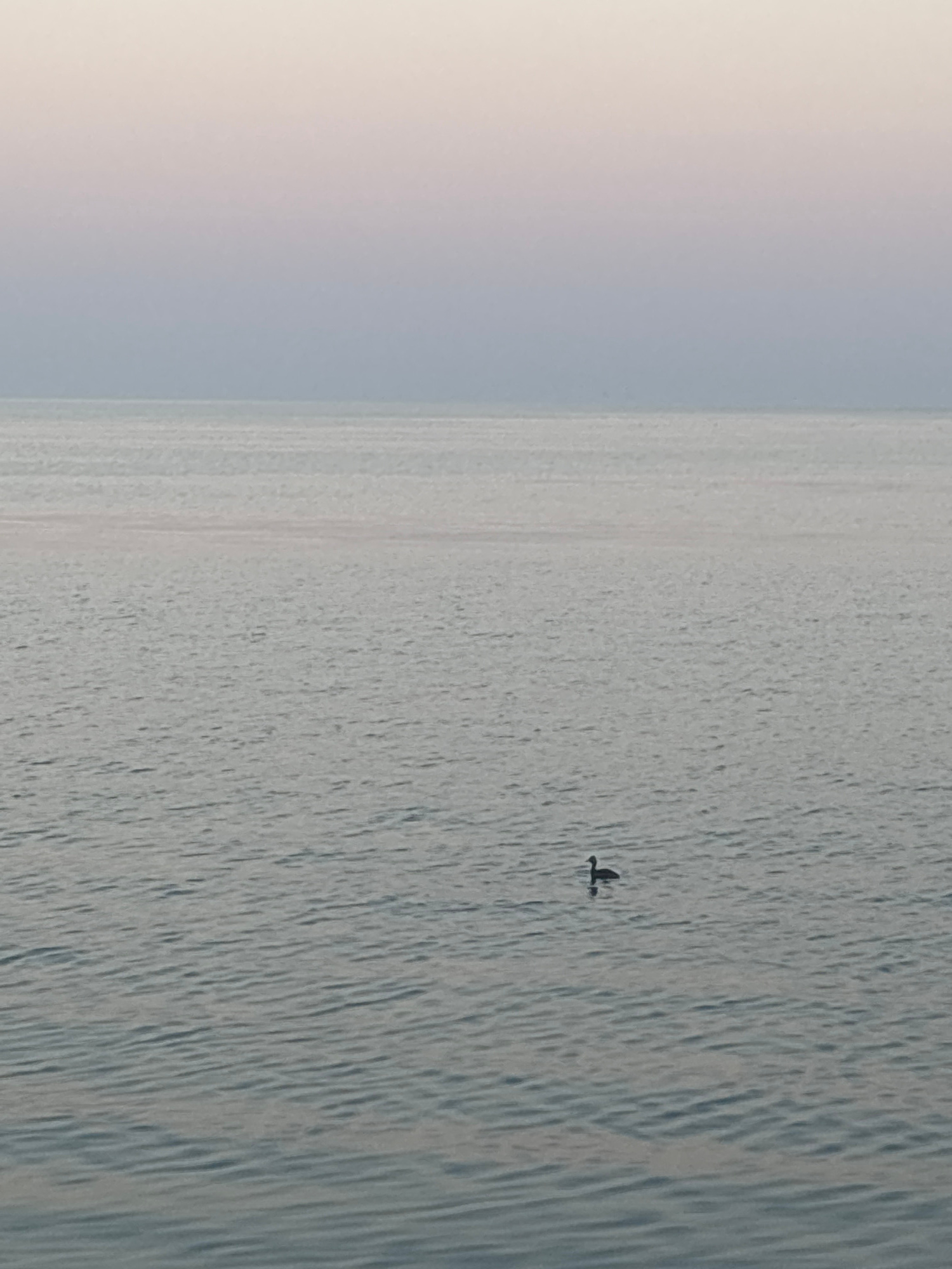 The image shows a body of water, possibly the Black Sea, as Varna is a coastal city in Bulgaria. A single bird is flying over the water. The sky is light gray, indicating a possibly overcast day.