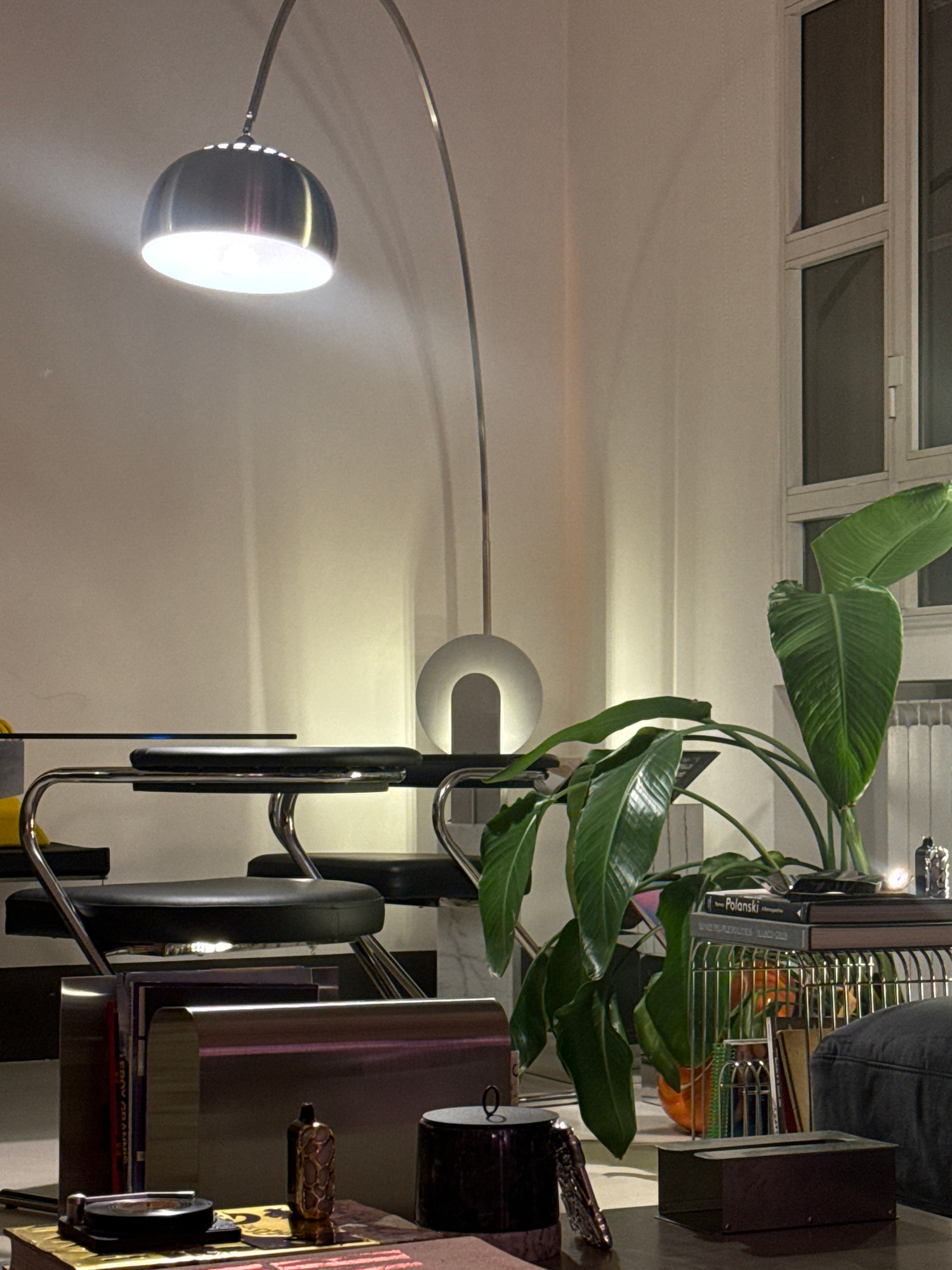 The image captures an indoor scene in what appears to be an apartment. A large window is visible in the upper left corner, revealing a daytime setting. An arched floor lamp, featuring a metallic spher…read more
