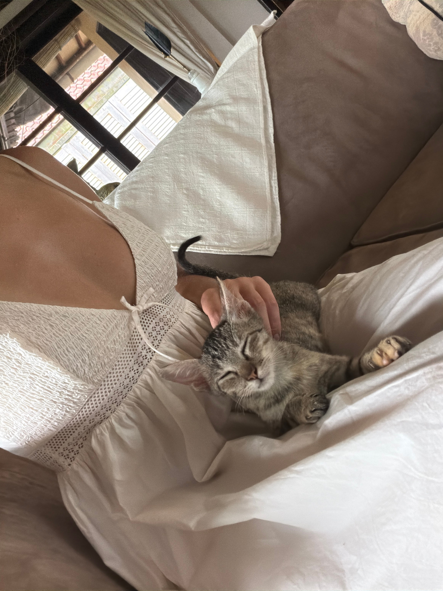 The image offers a close-up, top-down perspective of a person gently interacting with a sleeping cat in a cozy indoor setting, likely in Tegallalang, Indonesia. The primary subjects are a small, grey…read more