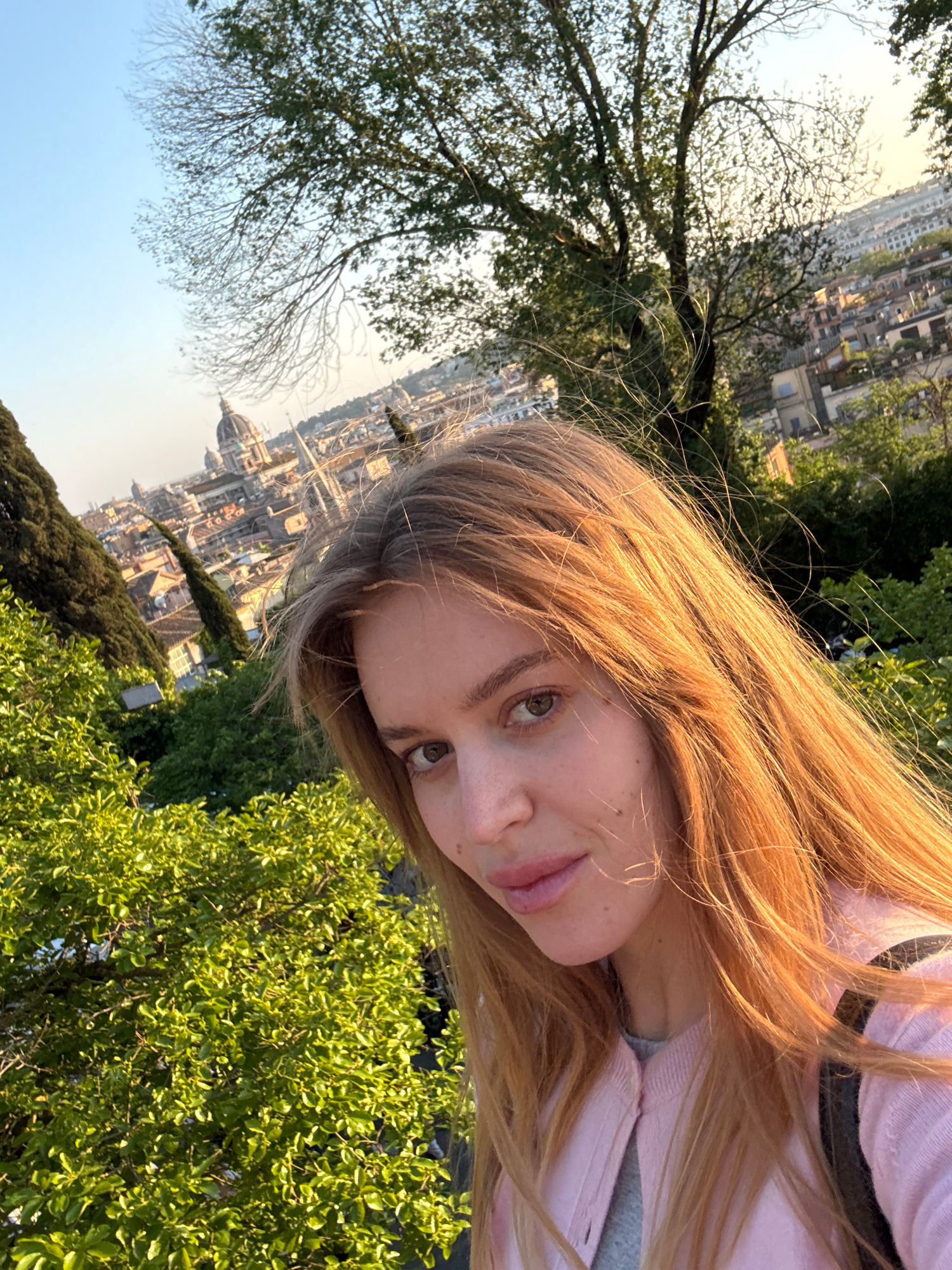 A woman with long blonde hair is taking a selfie in Rome, Italy. She is wearing a pink cardigan and appears to be standing in an elevated park or garden area. In the background, the cityscape of Rome…read more