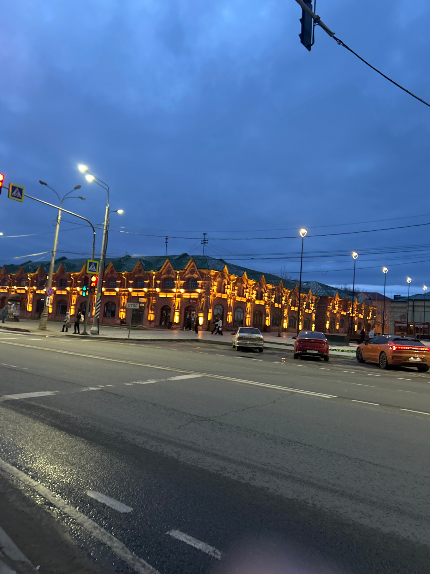 The image depicts a street scene in Klin, Russia, at dusk or early evening. The primary focus is on a long, ornate building facade illuminated with warm lights. The building appears to be a historical…read more