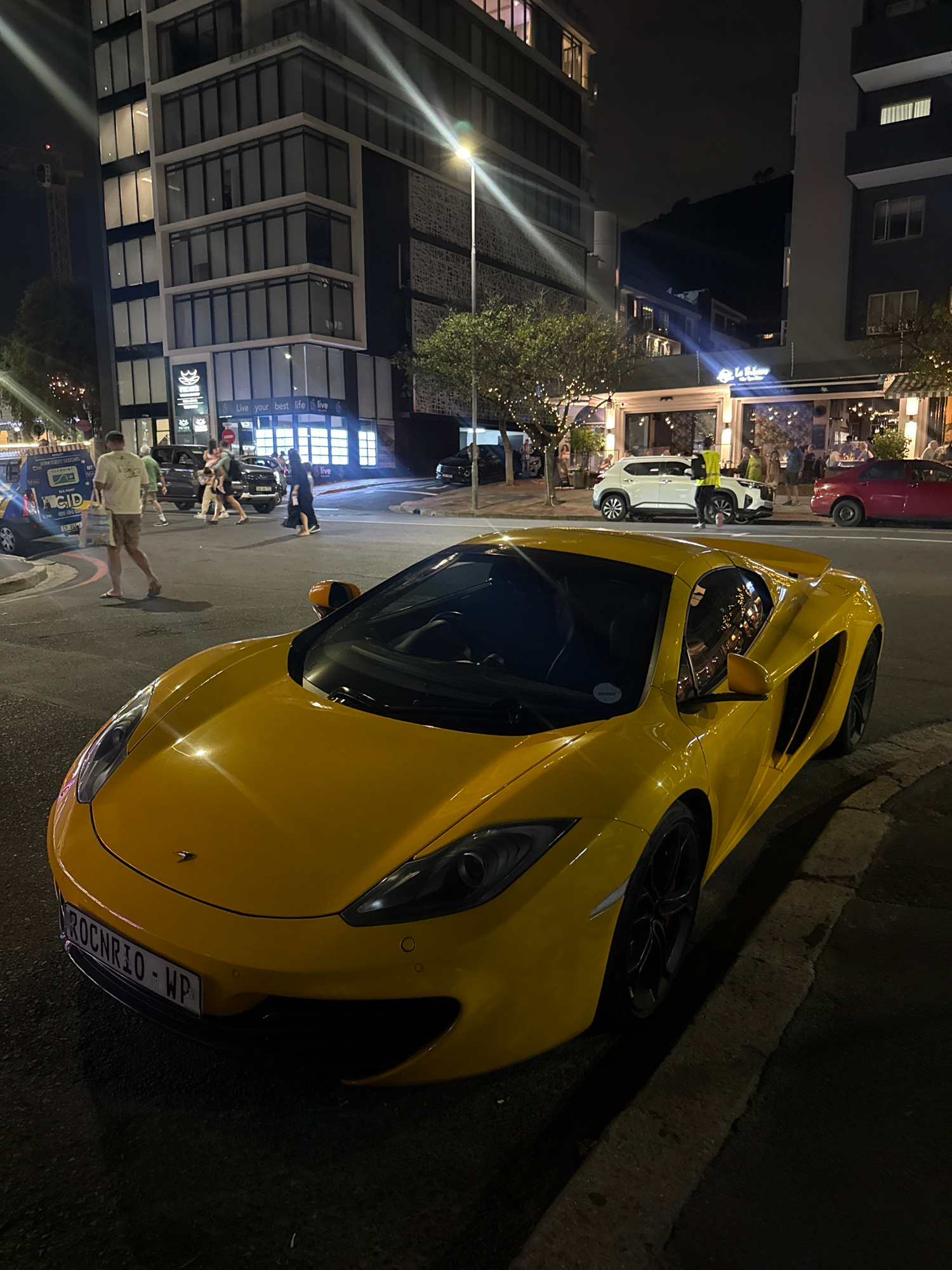 The image depicts a yellow McLaren sports car parked on the side of a street in Cape Town, South Africa, at night. The car's front end is prominently displayed, showcasing its sleek design. The licens…read more