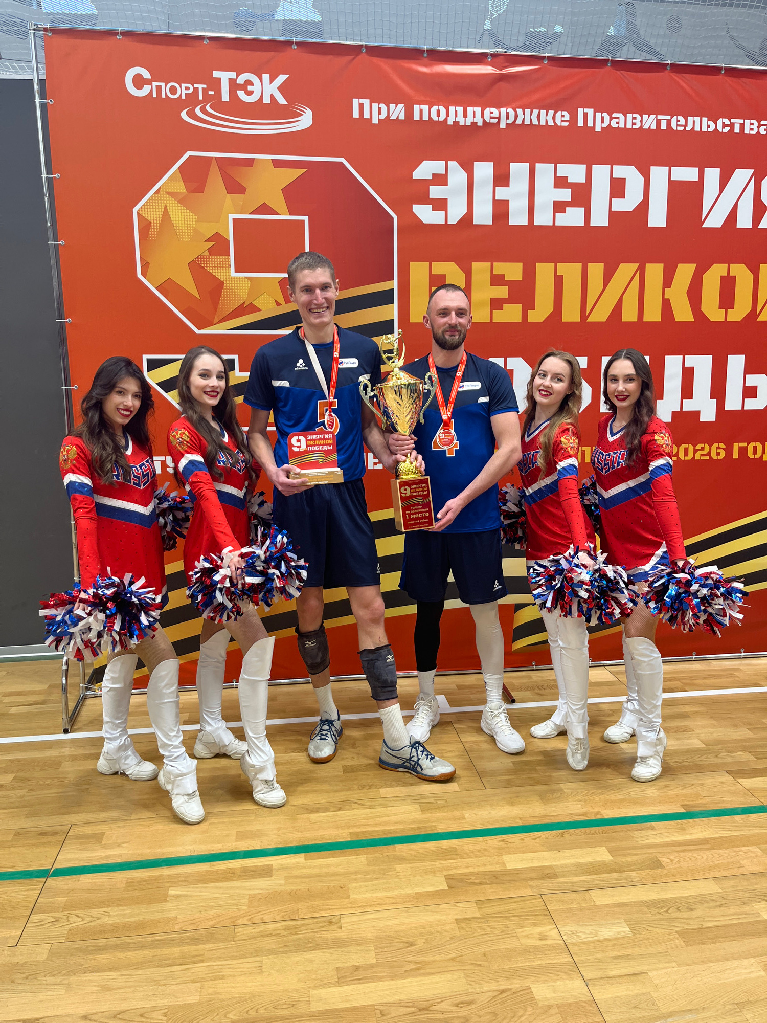 The image depicts a group of people in what appears to be a sports arena or gymnasium. The backdrop is a banner with Russian text including "СПОРТ-ТЭК", "ЭНЕРГИЯ ВЕЛИКОЙ ПОБЕДЫ", and "2026 год". Two…read more