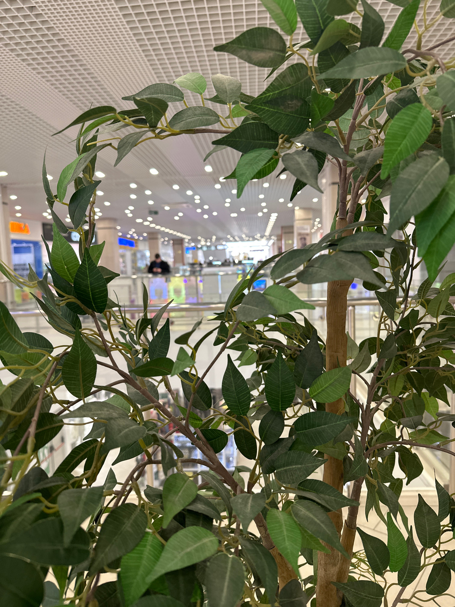 The image shows an interior view through artificial foliage. The background reveals a brightly lit commercial space, possibly a shopping mall. The foreground is dominated by artificial tree branches w…read more
