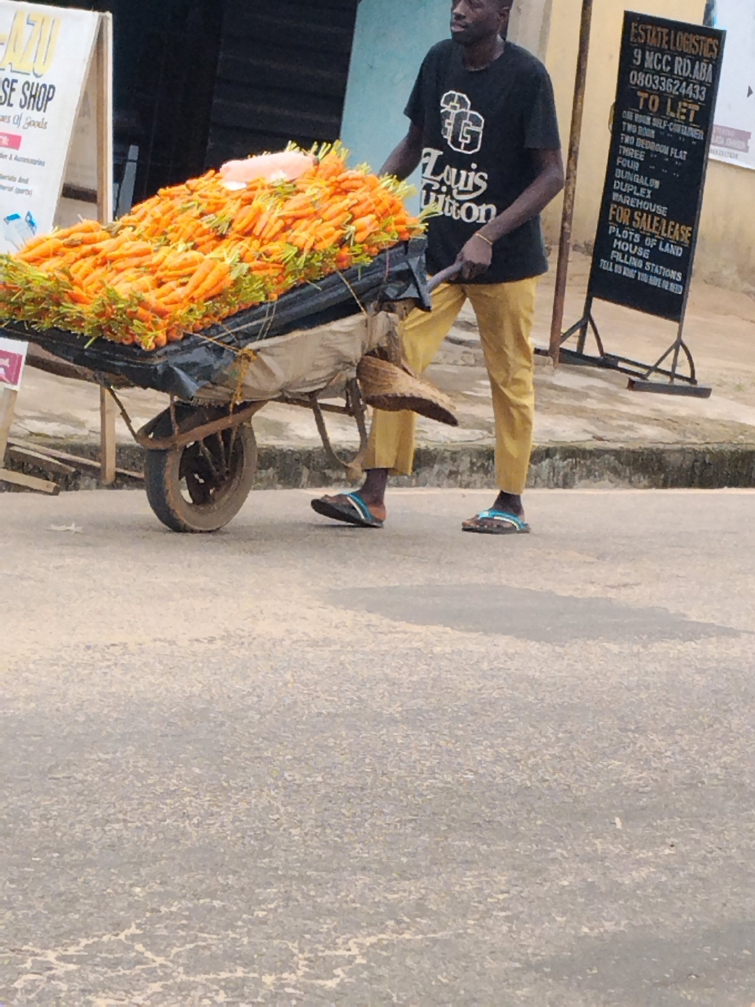 A man is pushing a wheelbarrow overflowing with carrots along a paved road in what appears to be Umuode, Nigeria. He wears a black t-shirt, yellow pants, and sandals. The wheelbarrow is heavily laden…read more
