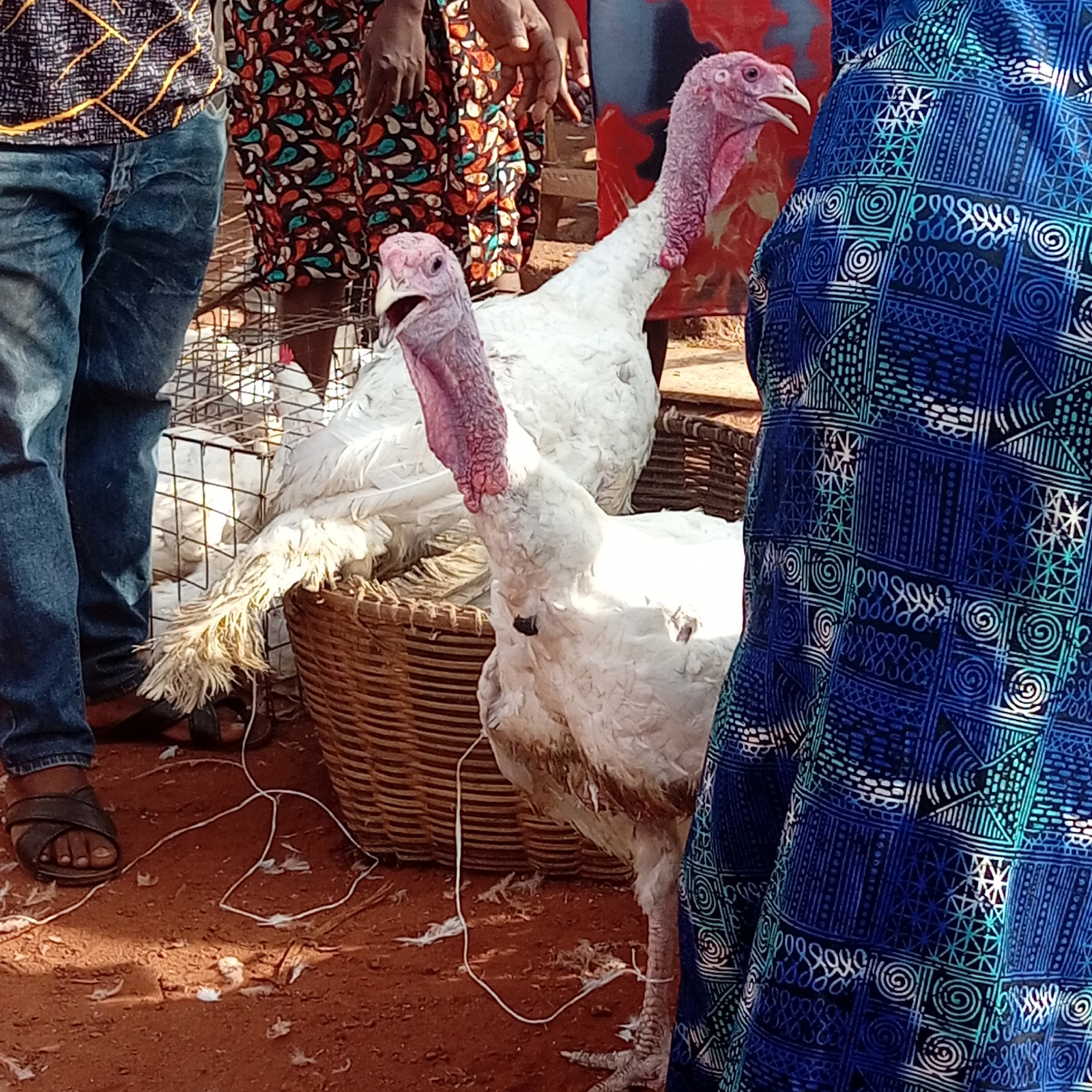 The image captures a scene at what appears to be a market in Nsukka, Nigeria. Two white turkeys are centrally positioned, seemingly for sale. One is in a woven basket, and another stands in front of i…read more