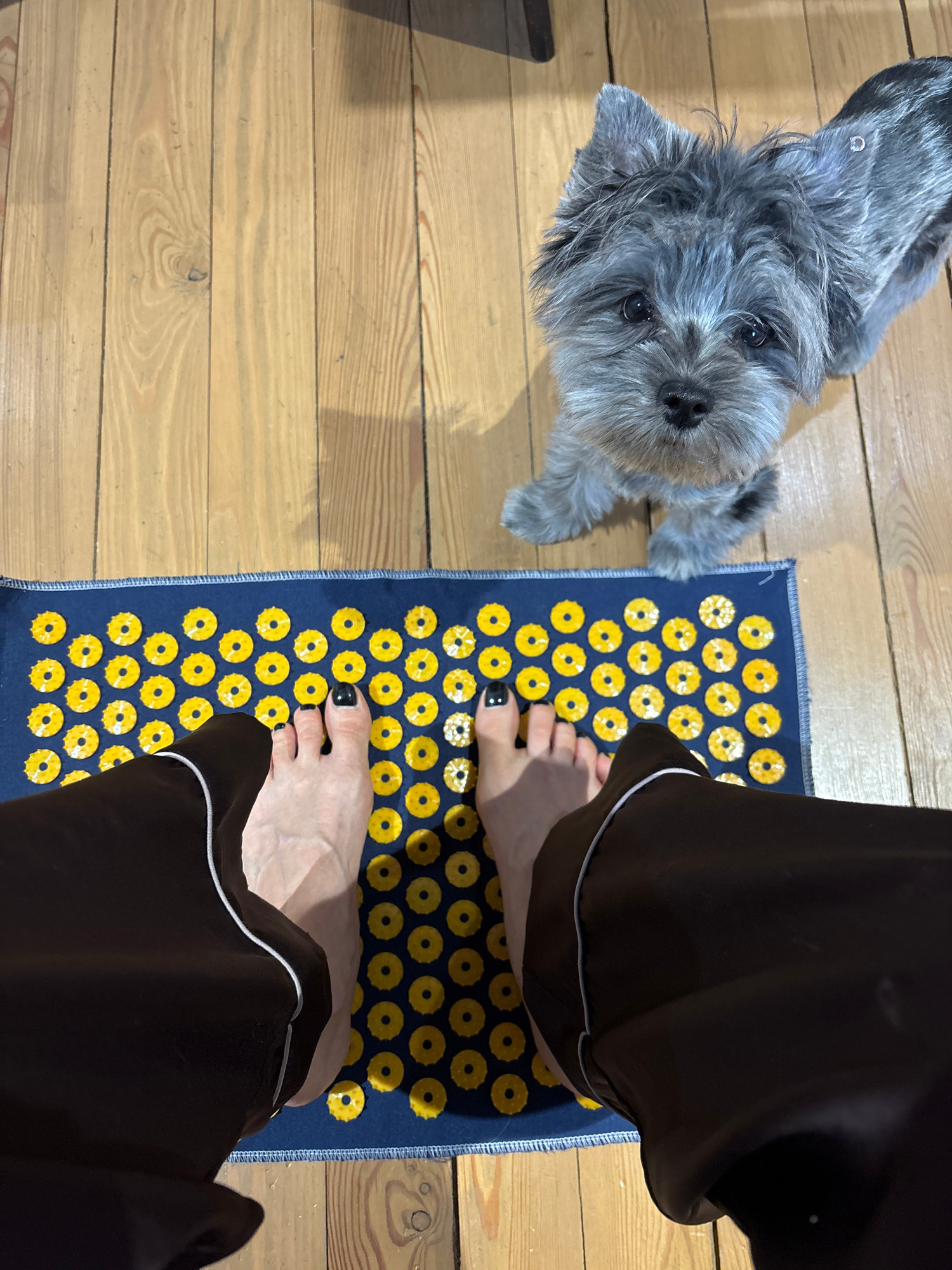A blue acupressure mat with yellow donut-shaped pressure points sits on a wooden floor in what appears to be a home. A person wearing dark, silky pajamas is standing on the mat with bare feet, their t…read more