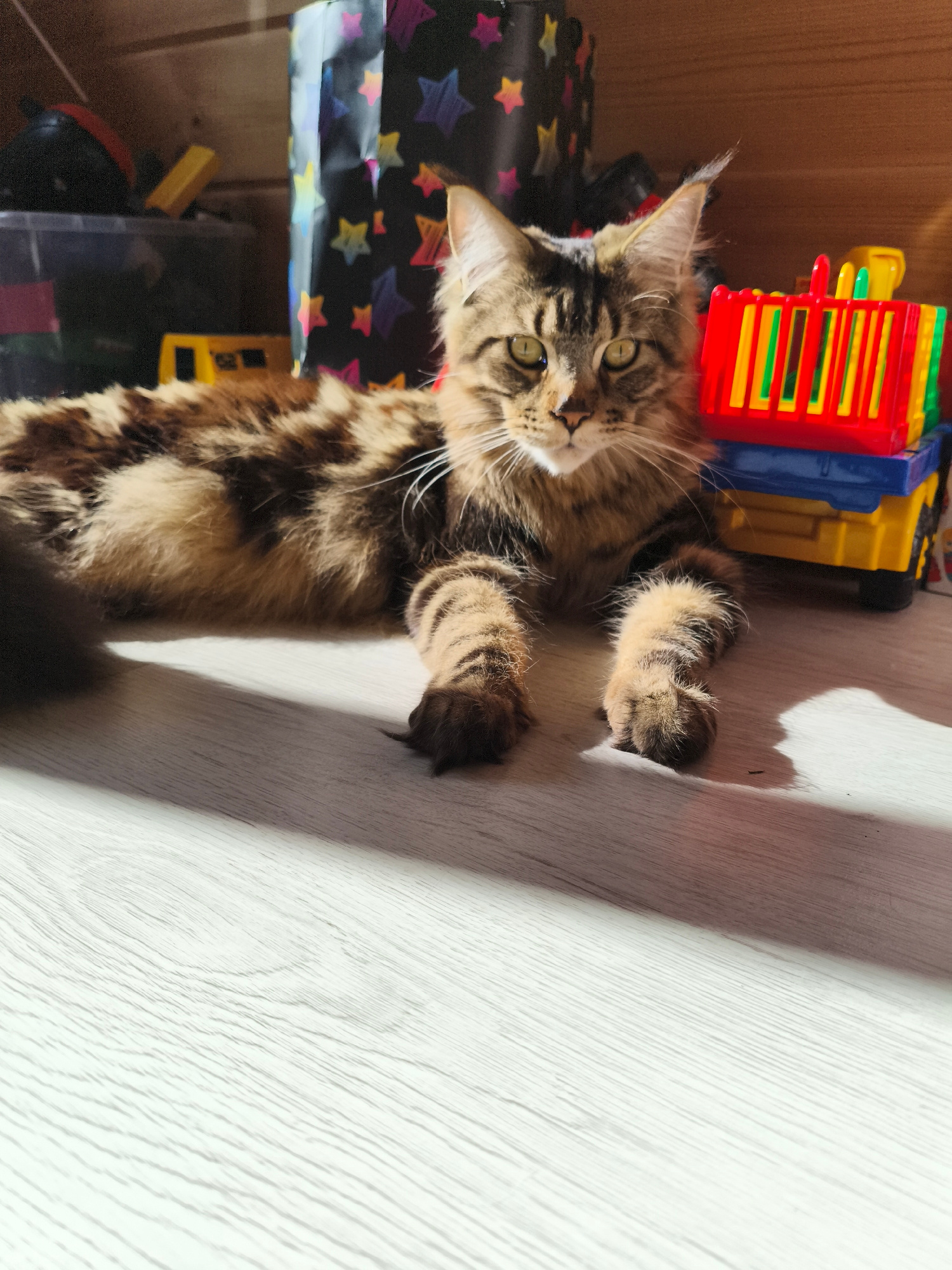 A Maine Coon cat is lying on a light-colored wooden floor. The cat has brown and black mottled fur and green eyes. The cat is facing forward with its paws outstretched. Behind the cat are a toy truck…read more