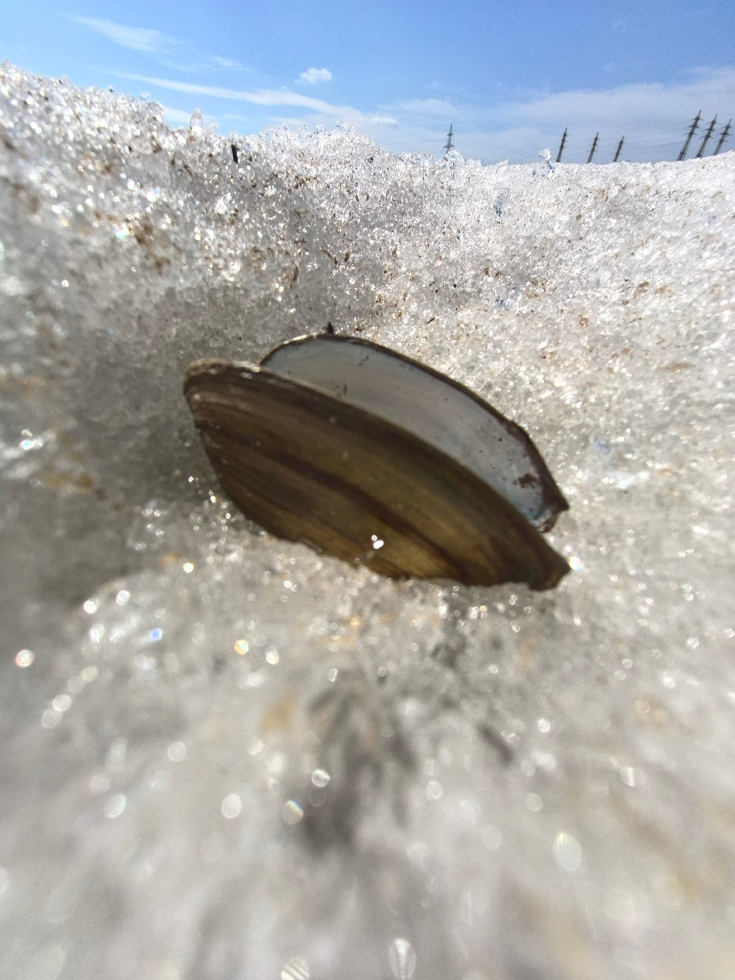 This close-up image, taken in Chaikovsky, Russia, features a bivalve shell resting on a bed of sparkling, melting ice or snow. The shell, possibly a freshwater mussel, appears to be partially open or…read more