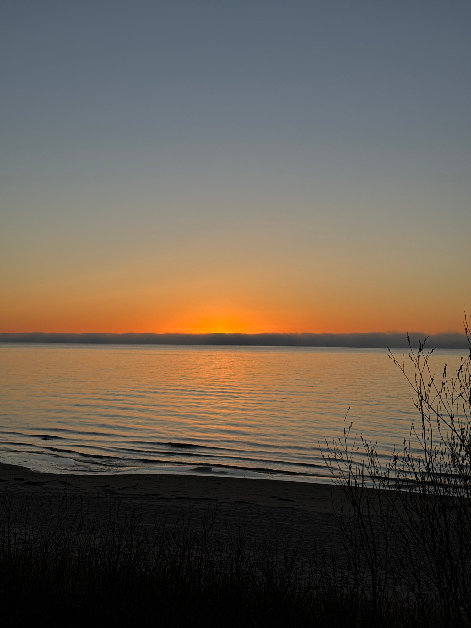 The image depicts a sunset over the sea in Carnikava, Latvia. The sky transitions from blue to orange as the sun sets on the horizon. The water is calm with small ripples, reflecting the orange light.…read more