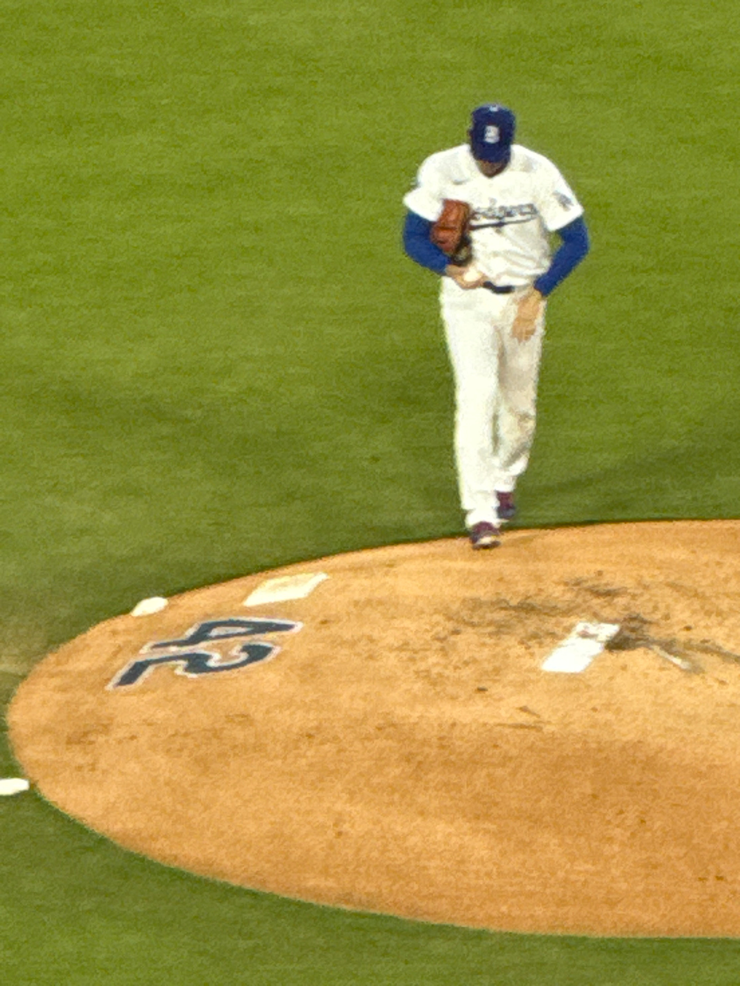 The image depicts a baseball player in a white uniform with blue accents, likely a Los Angeles Dodgers uniform, standing near the pitcher's mound. The number "42" is visible on the mound. The scene isβ¦read more