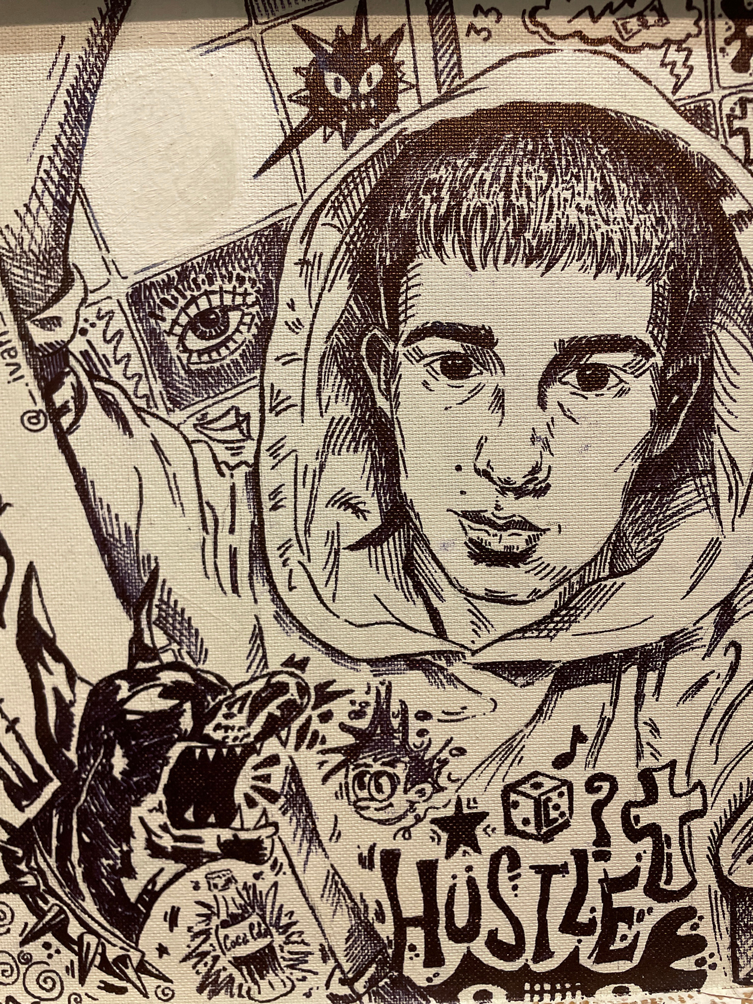 The image depicts a detailed monochrome illustration on what appears to be a canvas. A stylized human face is centrally positioned, gazing slightly downward. The individual has a hood or covering over…read more