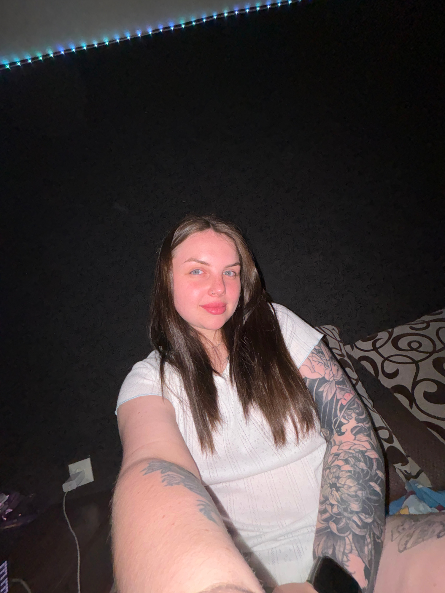 A woman with light skin, blue eyes, and brown hair is lying down, looking at the camera. She is wearing a white top. Her right arm is heavily tattooed. The background includes a patterned sofa and a b…read more