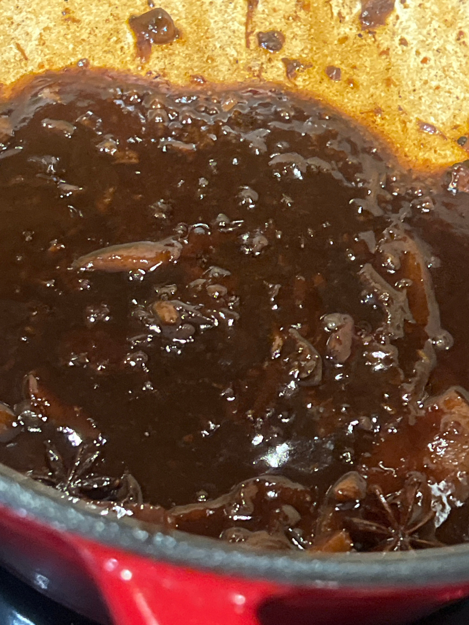 The image shows a close-up view of a dark brown, glistening stew or sauce in a cooking pot. The texture is thick and glossy, with visible pieces of cooked ingredients mixed within the sauce. Anise is…read more