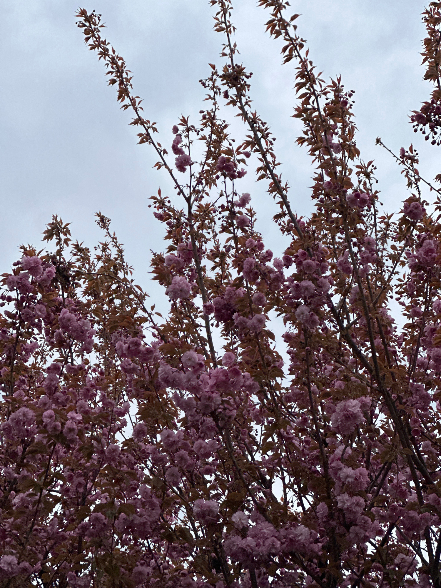 The image captures a view looking up into a cherry blossom tree in full bloom against a cloudy, overcast sky. The location is likely in City of Zagreb, Croatia, judging by the urban setting often asso…read more
