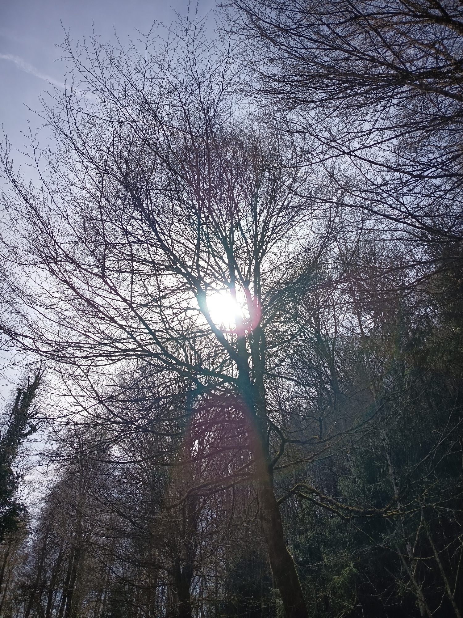 The image depicts a forest scene, likely located in Neuendorf, Switzerland, given the prompt. The sun is visible through the bare branches of a tall deciduous tree in the center of the frame, creating…read more