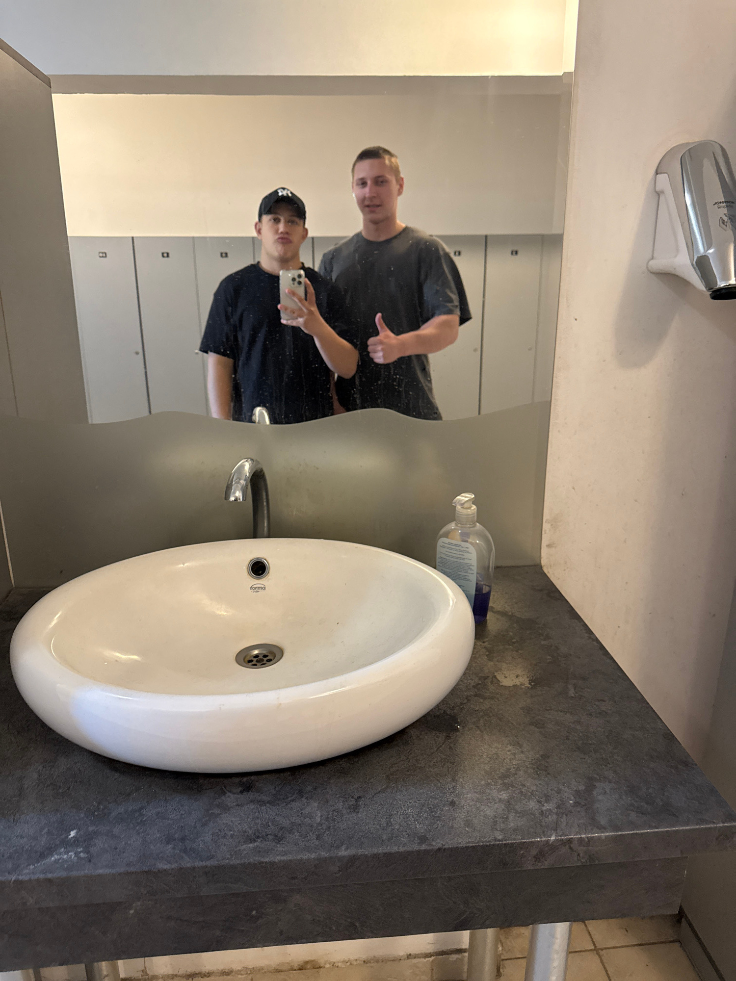 The image depicts a restroom in Panagyurishte, Bulgaria. The scene features a sink with a white, oval basin set on a dark gray countertop. To the left of the sink, a large mirror reflects a man givingβ¦read more