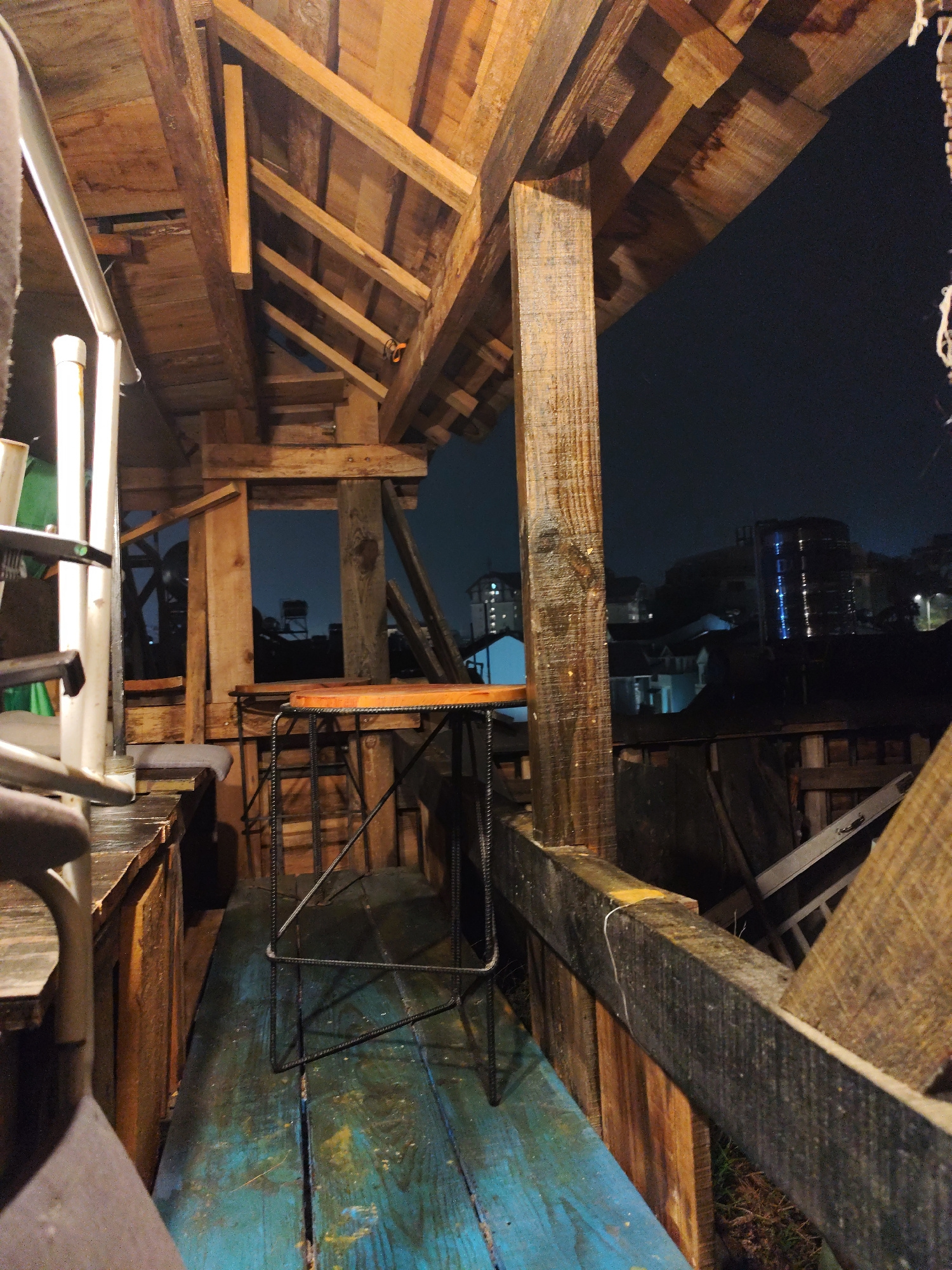 The image shows a partially enclosed wooden structure, likely a balcony or outdoor seating area, located in Da Lat, Vietnam. The structure is constructed from rough-hewn timber with a prominent roof o…read more