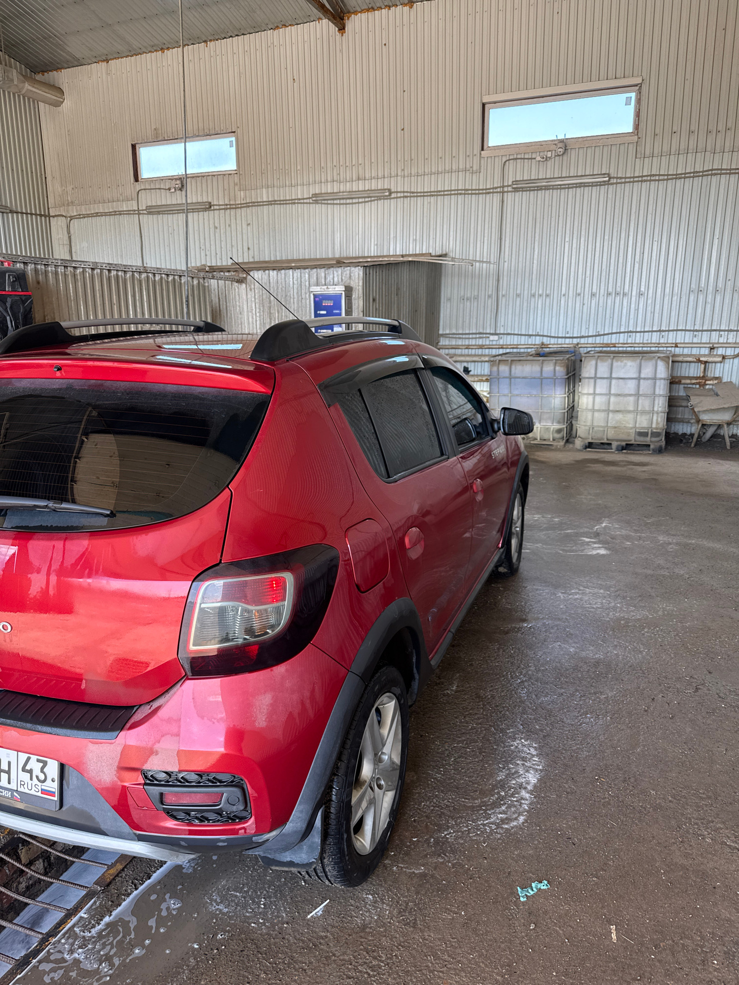 The image displays a red crossover vehicle, identifiable as a Renault Sandero Stepway from the "STEPWAY" badge on its side, parked inside a large, industrial-style building. The car is oriented with i…read more