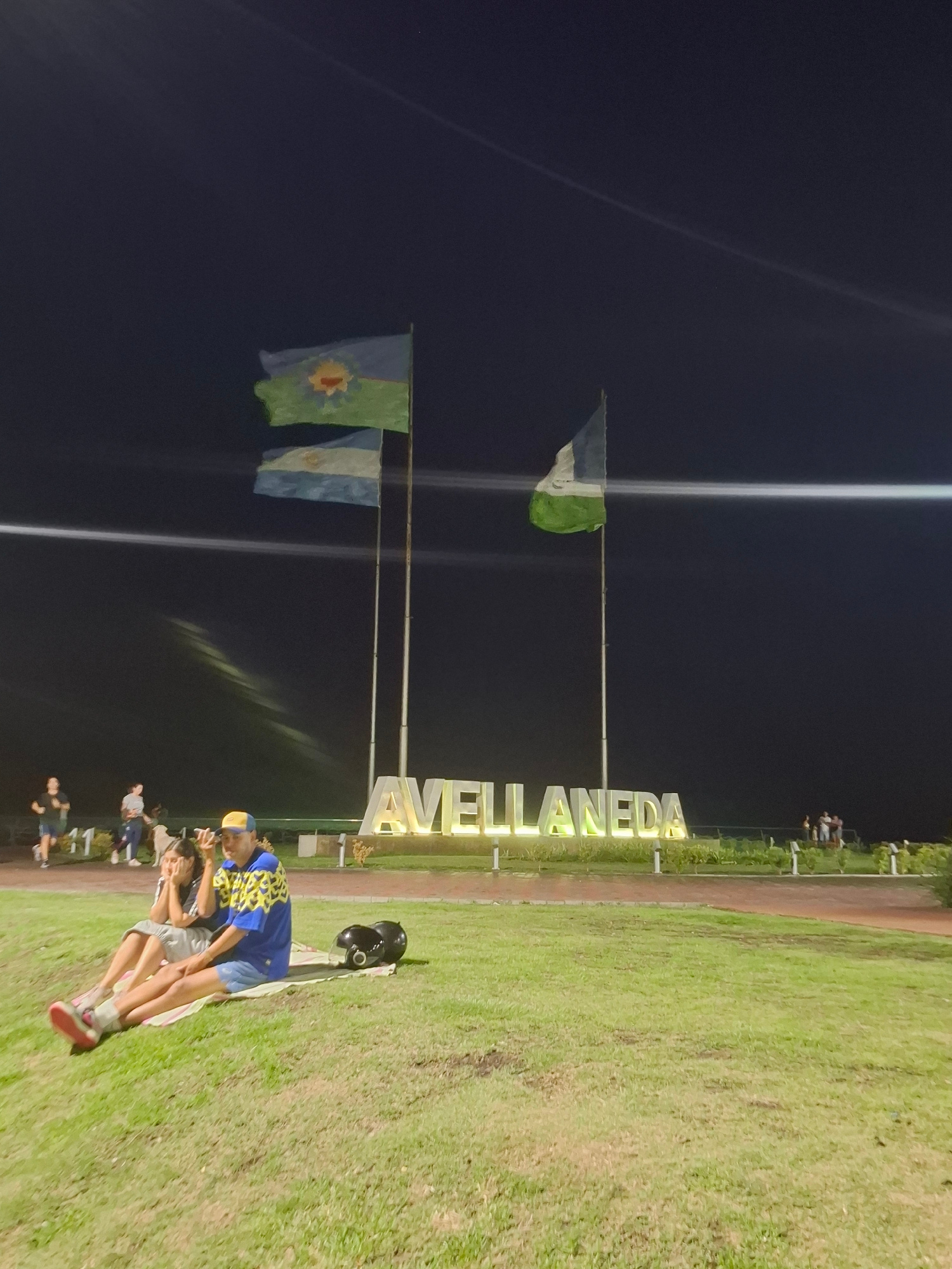 Captured at night in Villa Domínico, Argentina, the scene shows a grassy area with a large "AVELLANEDA" sign illuminated in yellow. Three flags on poles are visible, including the Argentinian flag. Se…read more