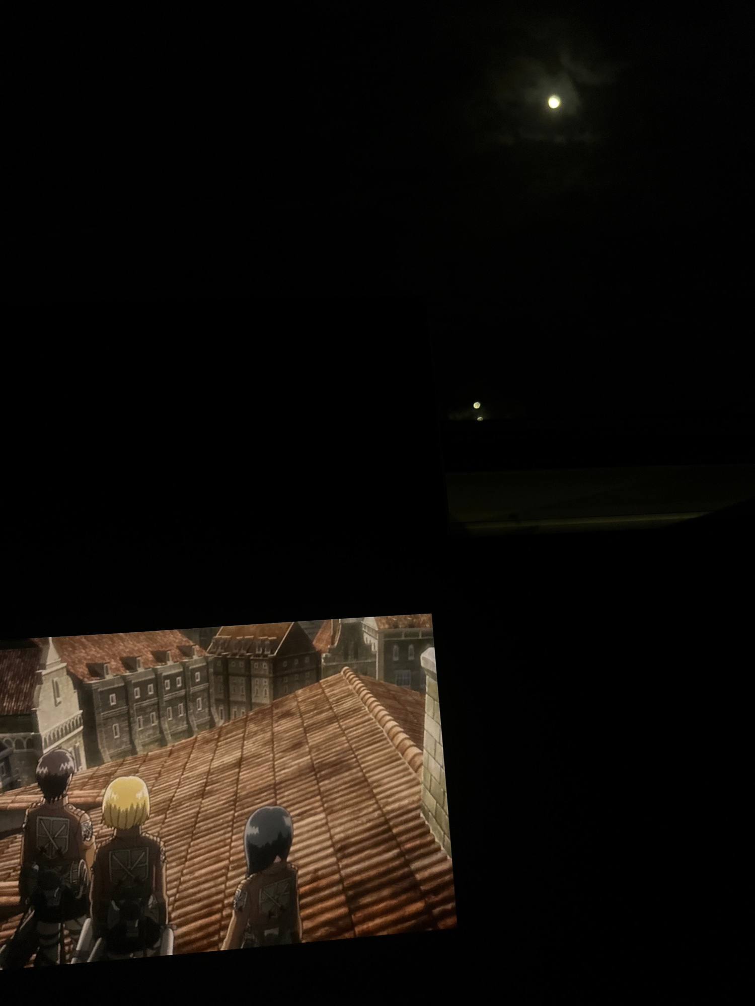 The image shows a dark scene with a small, bright moon in the upper left corner. To the right, there is a vertical structure with two glowing points that might be lights or reflective surfaces. In the…read more