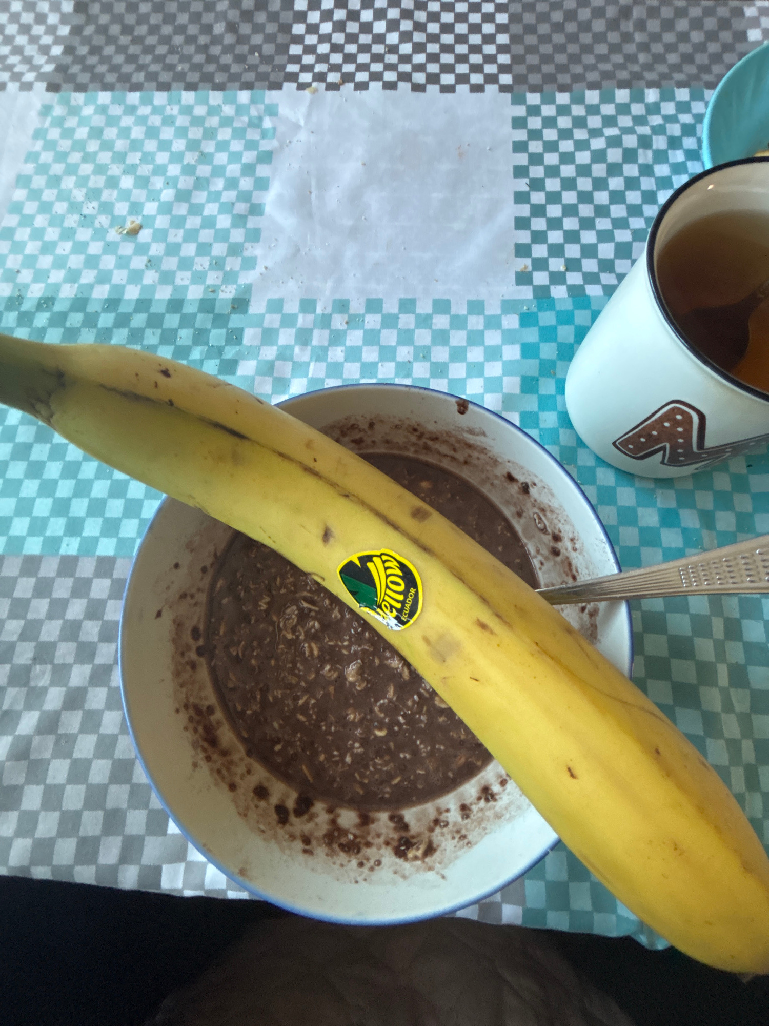 The image shows a breakfast scene. On a checkered tablecloth, there's a mug with a brown liquid, likely tea or coffee, and a bowl filled with a dark, porridge-like substance, possibly oatmeal. A banan…read more