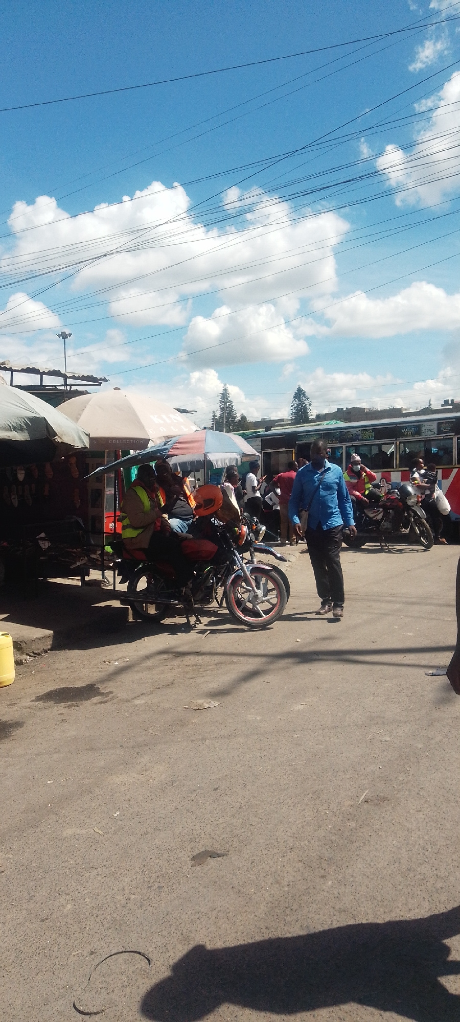 The image depicts a street scene in Nairobi, Kenya, with a mixture of commercial and transportation activities. The sky is blue with scattered white clouds, and numerous power lines crisscross overhea…read more