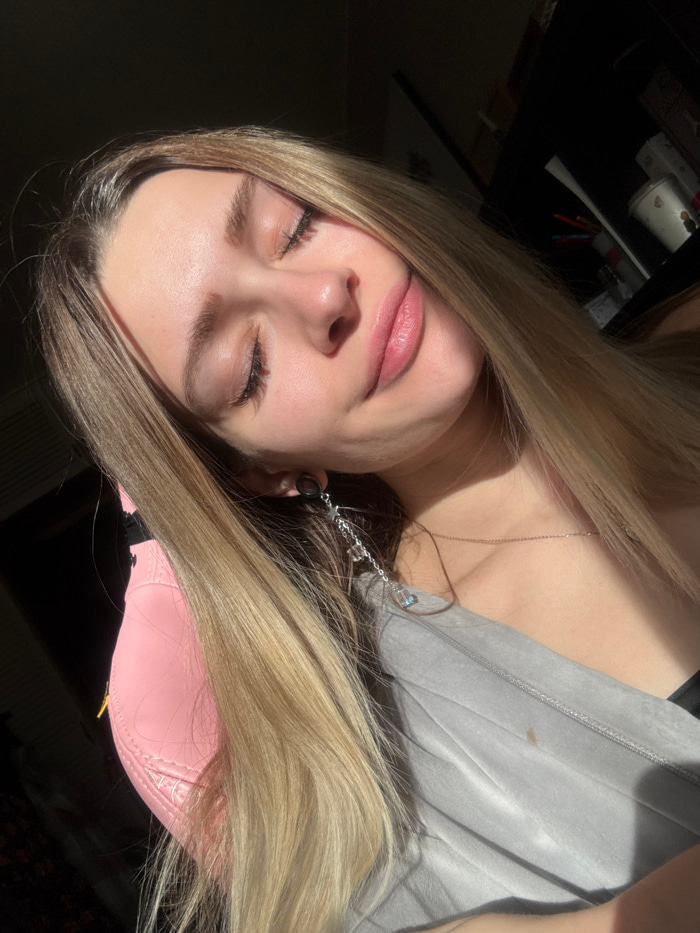 A female individual is depicted in a close-up indoor portrait, illuminated by direct sunlight, presumably located in Reutov, Russia. She has long, straight blonde hair with darker roots, closed eyelid…read more