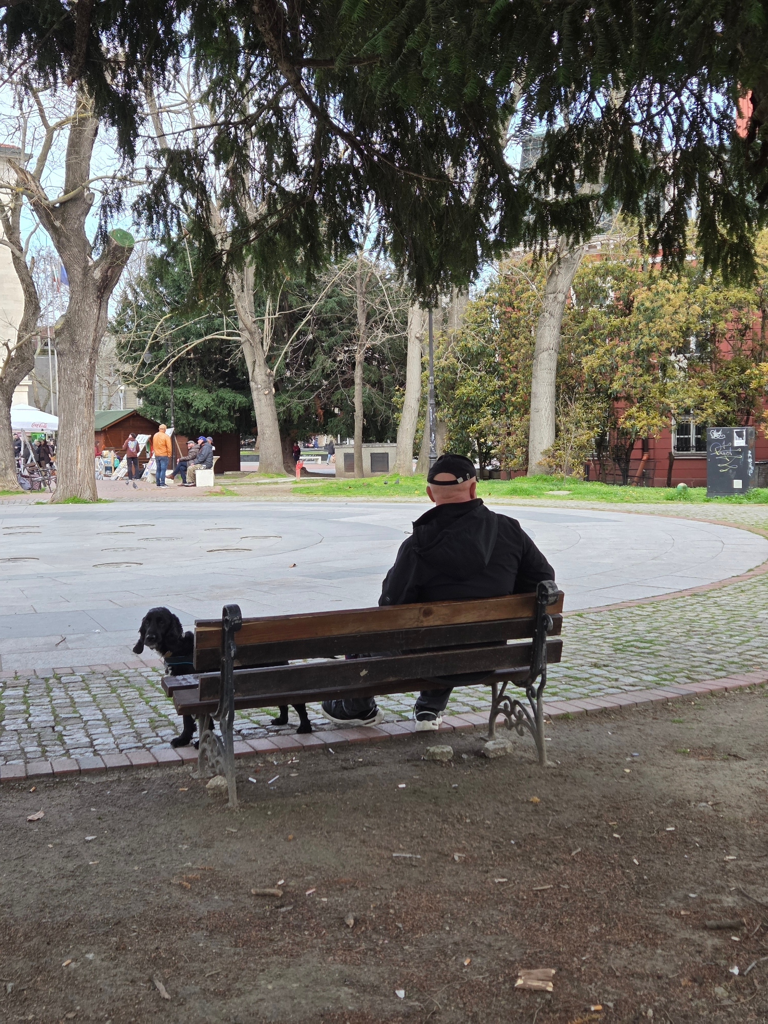 A man in a black jacket and cap sits on a wooden bench in a park. The bench is located on a paved pathway with a brick border. The ground beside the path is littered with debris and cigarette butts. I…read more