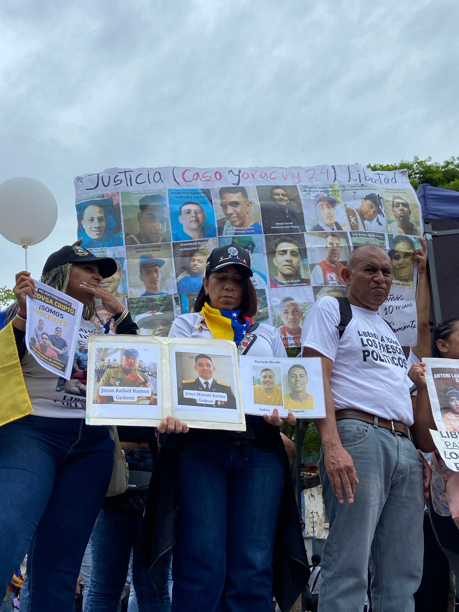 This image captures an outdoor demonstration in Caracas, Venezuela, under an overcast sky during the daytime. Several people are gathered, holding signs and banners, advocating for justice and the rel…read more