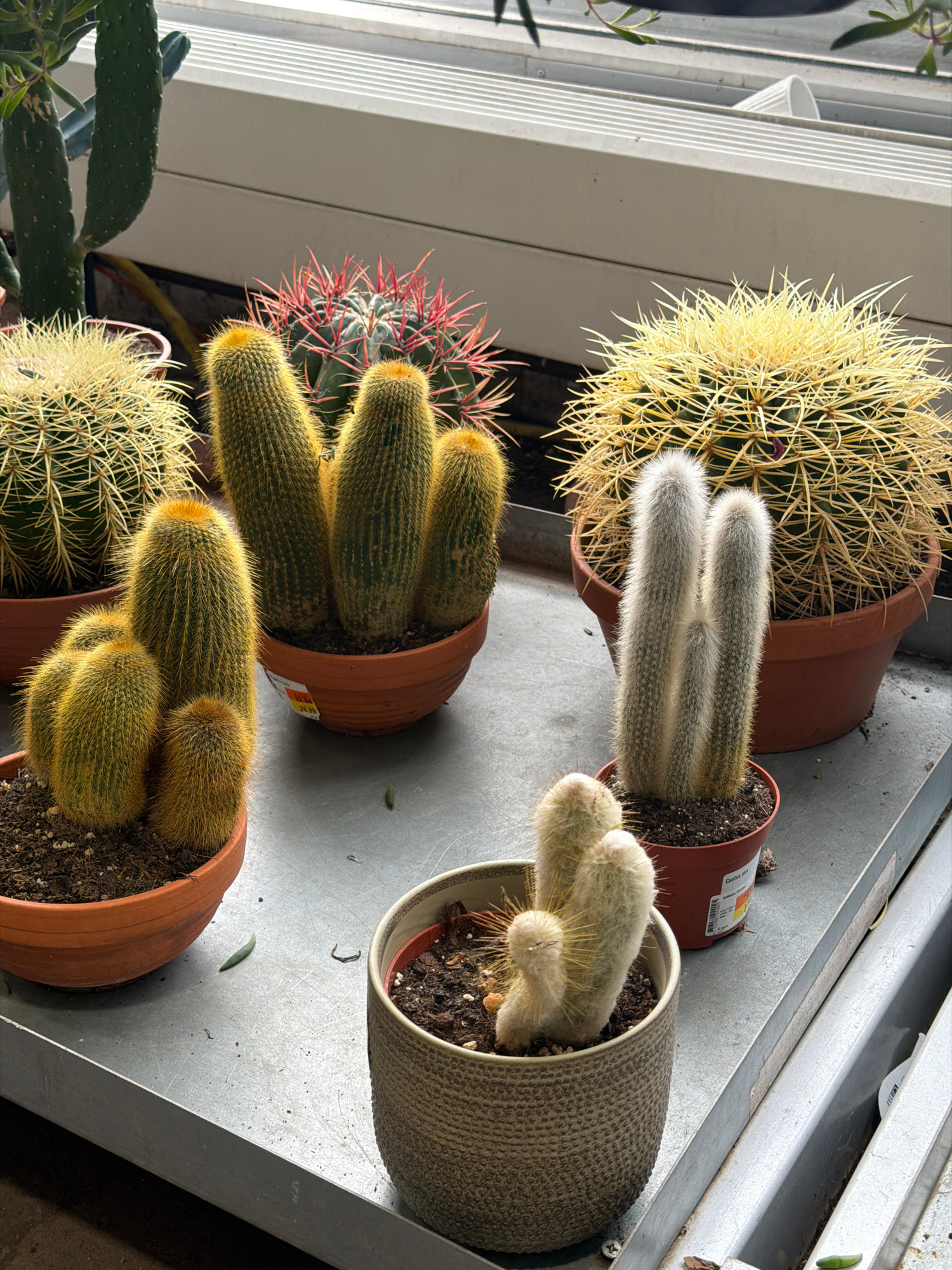 The scene depicts an assortment of potted cacti and succulents arranged on a grey metal surface, likely a display shelf or window sill, within an indoor environment located in Dreiliņi, Latvia. Natura…read more