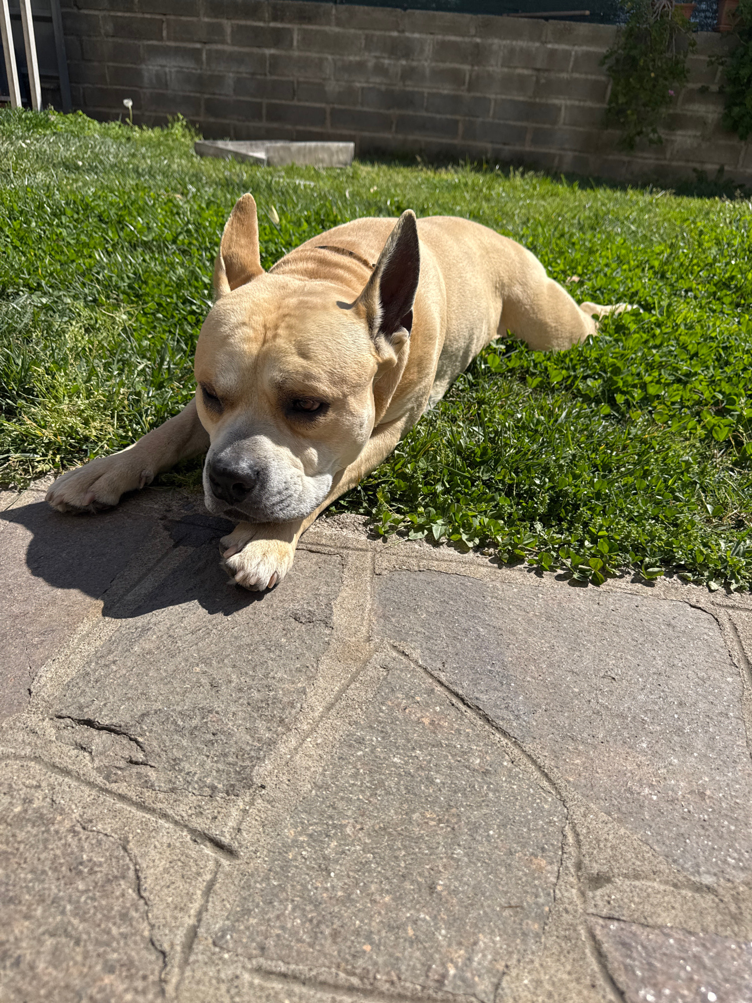 A medium-sized, light tan dog with a white muzzle is lying on a patch of green grass that abuts a stone-paved area. The dog is stretched out, with its front paws resting on the stone. The setting appe…read more
