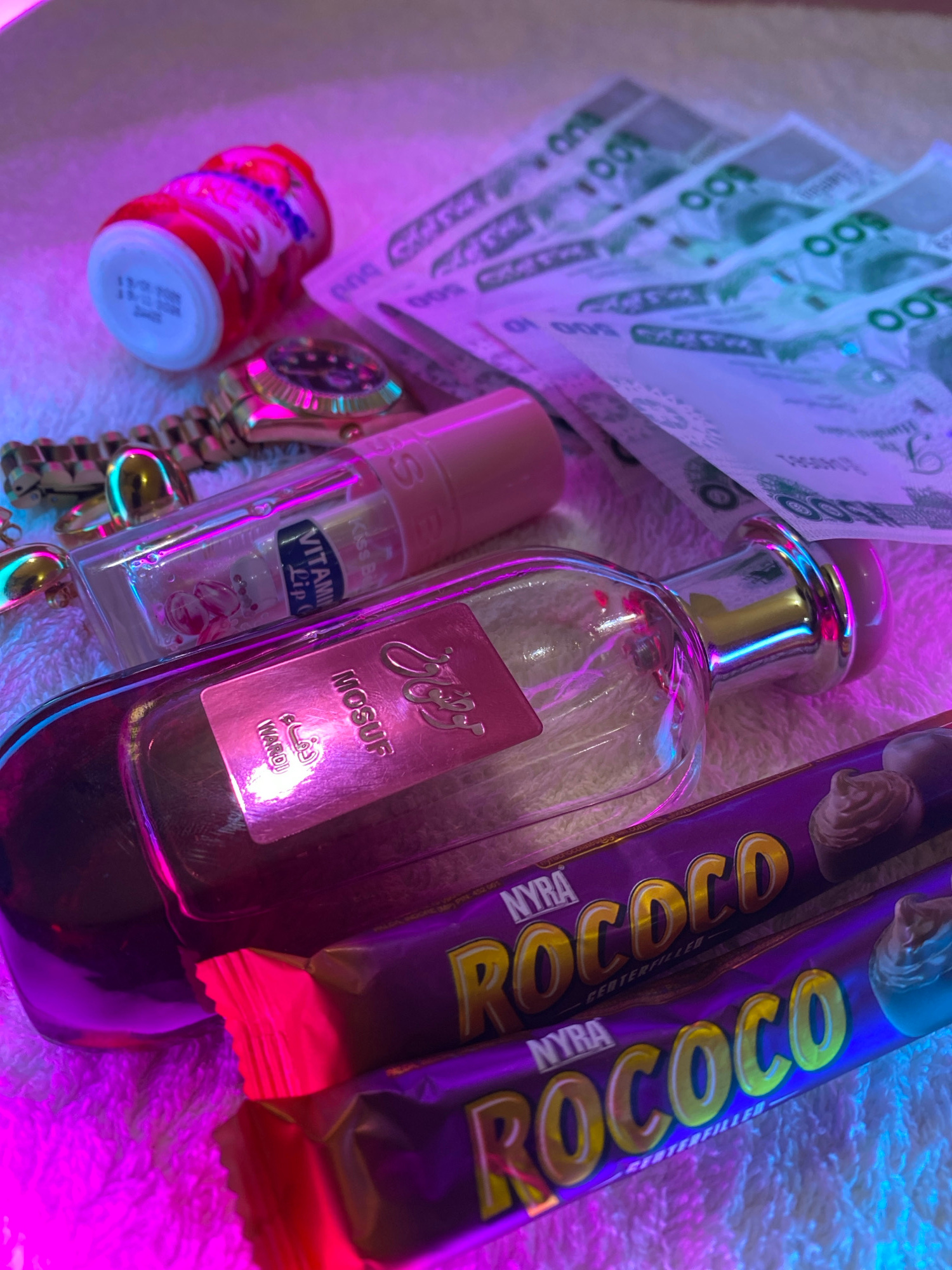 A vibrant flat lay composition showcases an array of personal items and currency, set against a light-colored, textured surface under strong pink and purple lighting in Maigizo, Nigeria. In the upper…read more