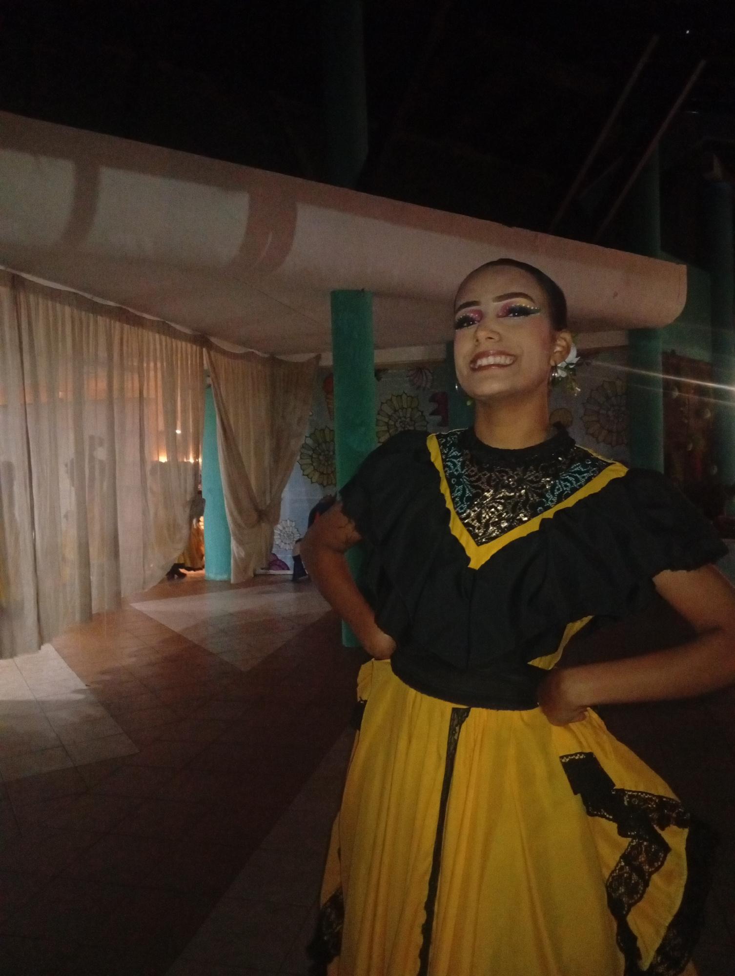 The image shows a young woman standing indoors. She is wearing a traditional dress, likely for a cultural performance. The dress has a black top with yellow trim and a yellow skirt with black lace acc…read more