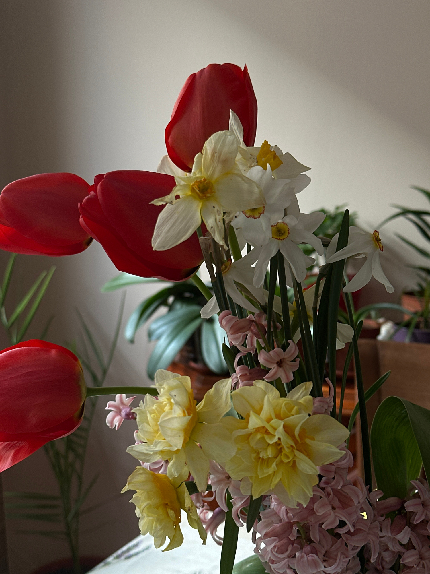 The image shows a bouquet of flowers. The bouquet includes red tulips, white daffodils, yellow daffodils, and pink hyacinths. The flowers are arranged in a vase or container that is not visible. The b…read more