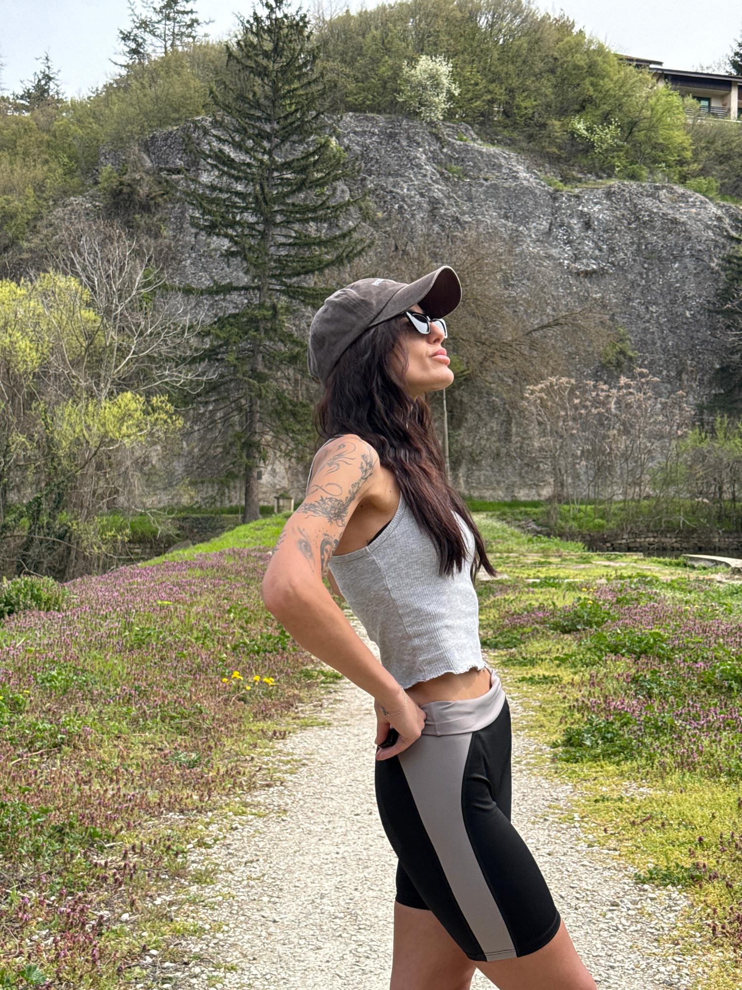 The image shows a woman standing on a gravel path next to a flower bed. The woman is wearing a grey tank top, black and grey shorts, a baseball cap, and sunglasses. She has long brown hair and tattoos…read more