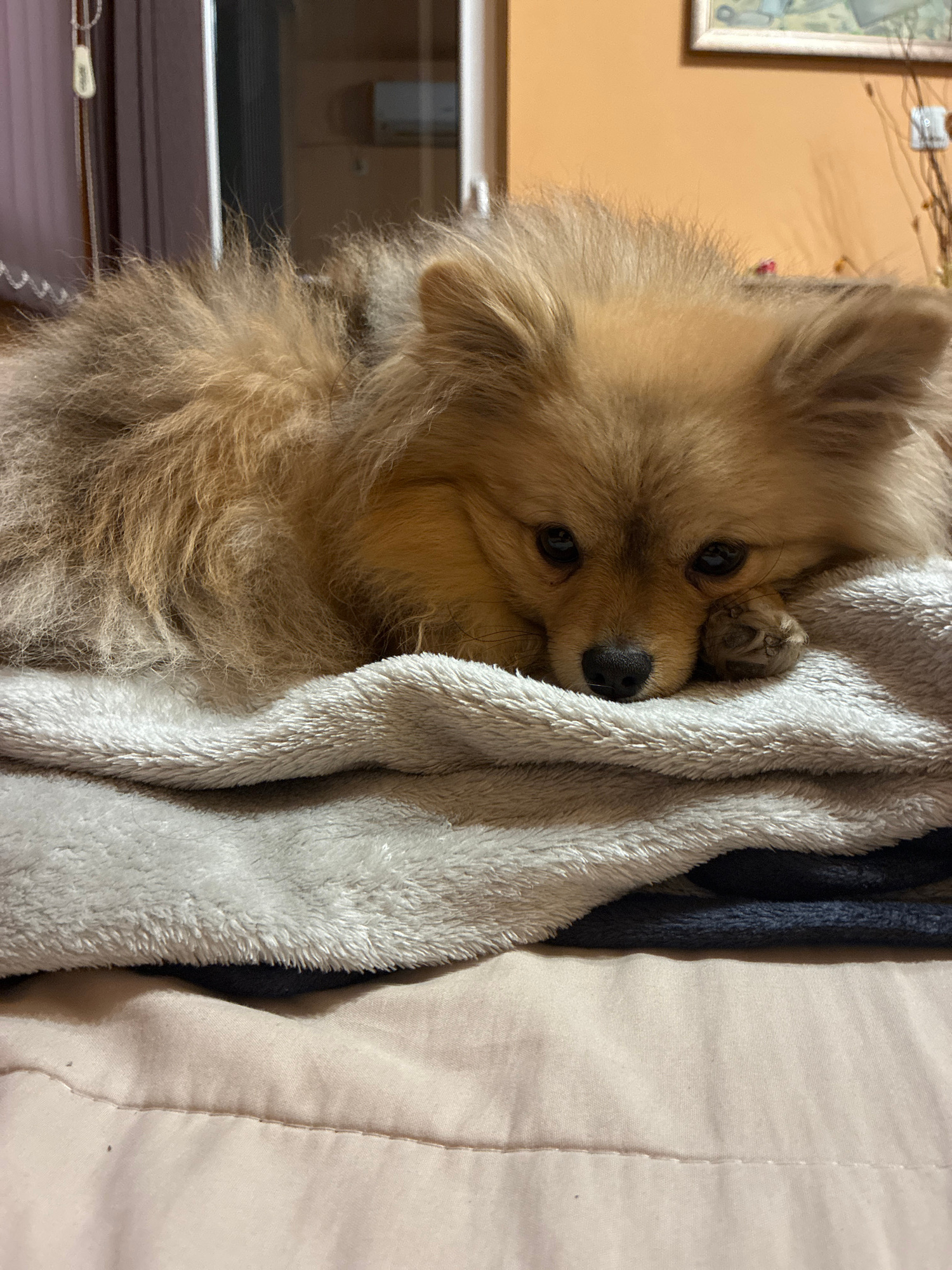 A close-up, slightly angled portrait shows a fluffy, light-brown Pomeranian dog partially nestled within a light-colored, soft, textured blanket. The dog's head is tilted, with its dark eyes gazing di…read more