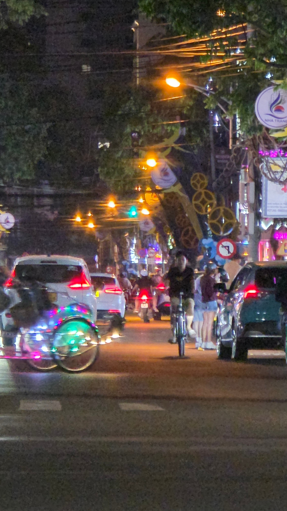 This media file captures a vibrant street scene at night in Nha Trang, Vietnam. The image is oriented vertically, showing a busy urban environment illuminated by numerous artificial lights. **Subject…read more