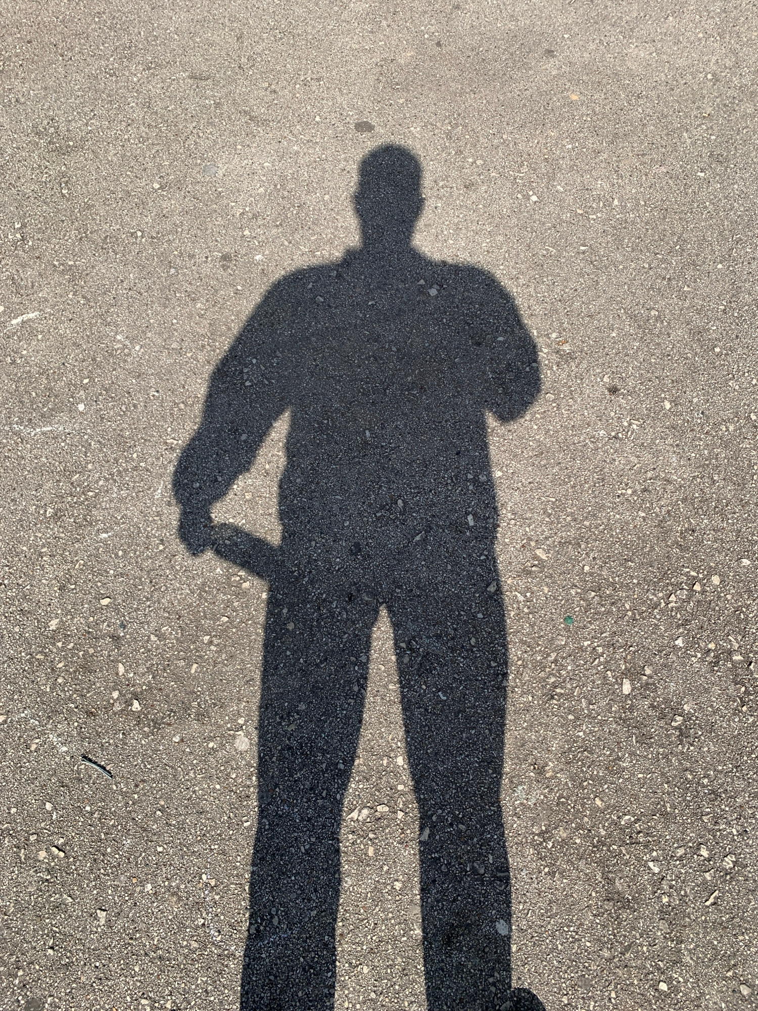 This image features a prominent, elongated human shadow cast across a textured outdoor ground surface, likely asphalt or coarse concrete. The shadow depicts a person in a standing or casually walking…read more