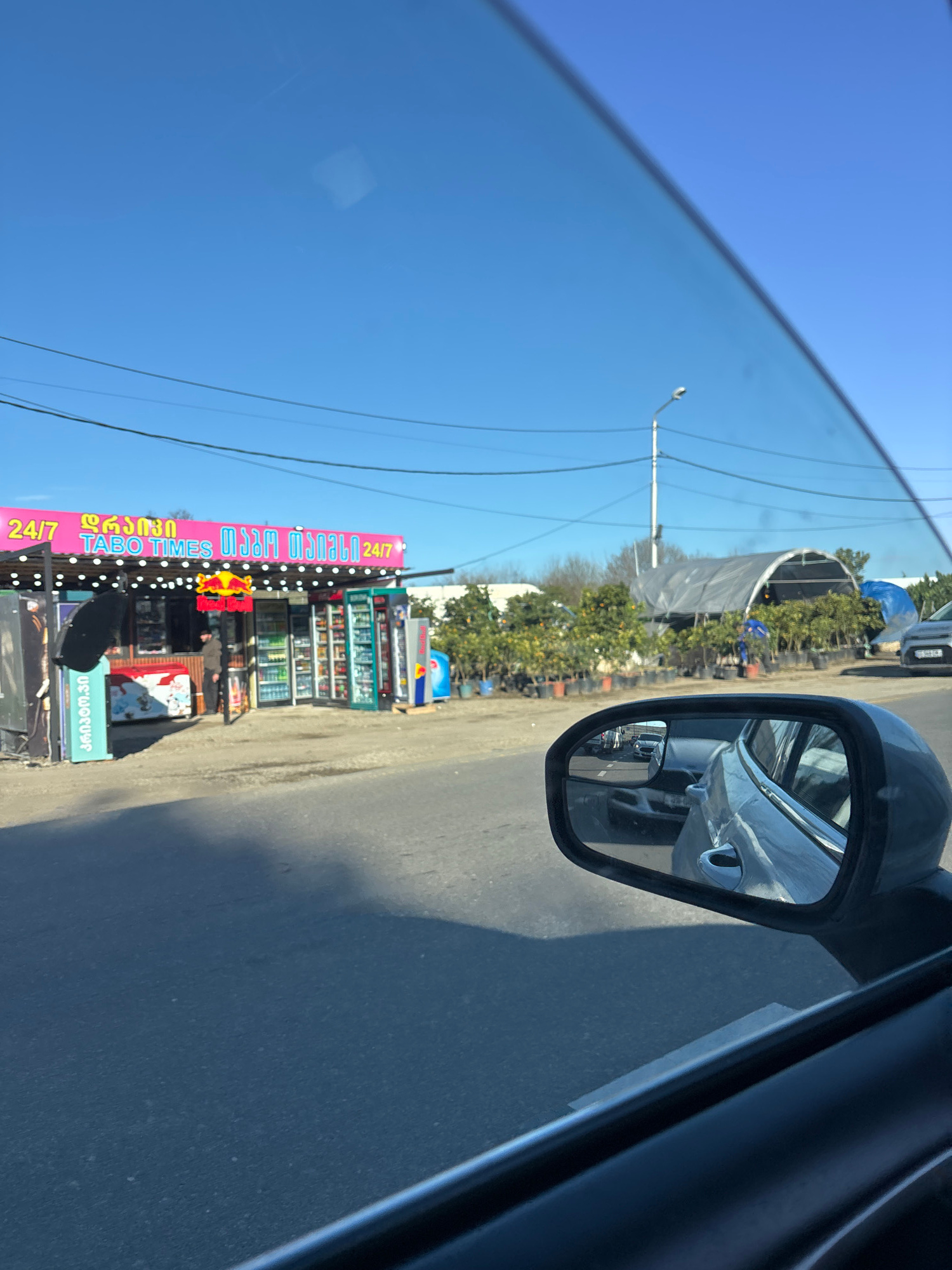 The image shows a view from inside a car, looking out. The scene captures a bright, clear day with a cloudless blue sky visible through the car window. Overhead power lines stretch across the sky. Aloβ¦read more