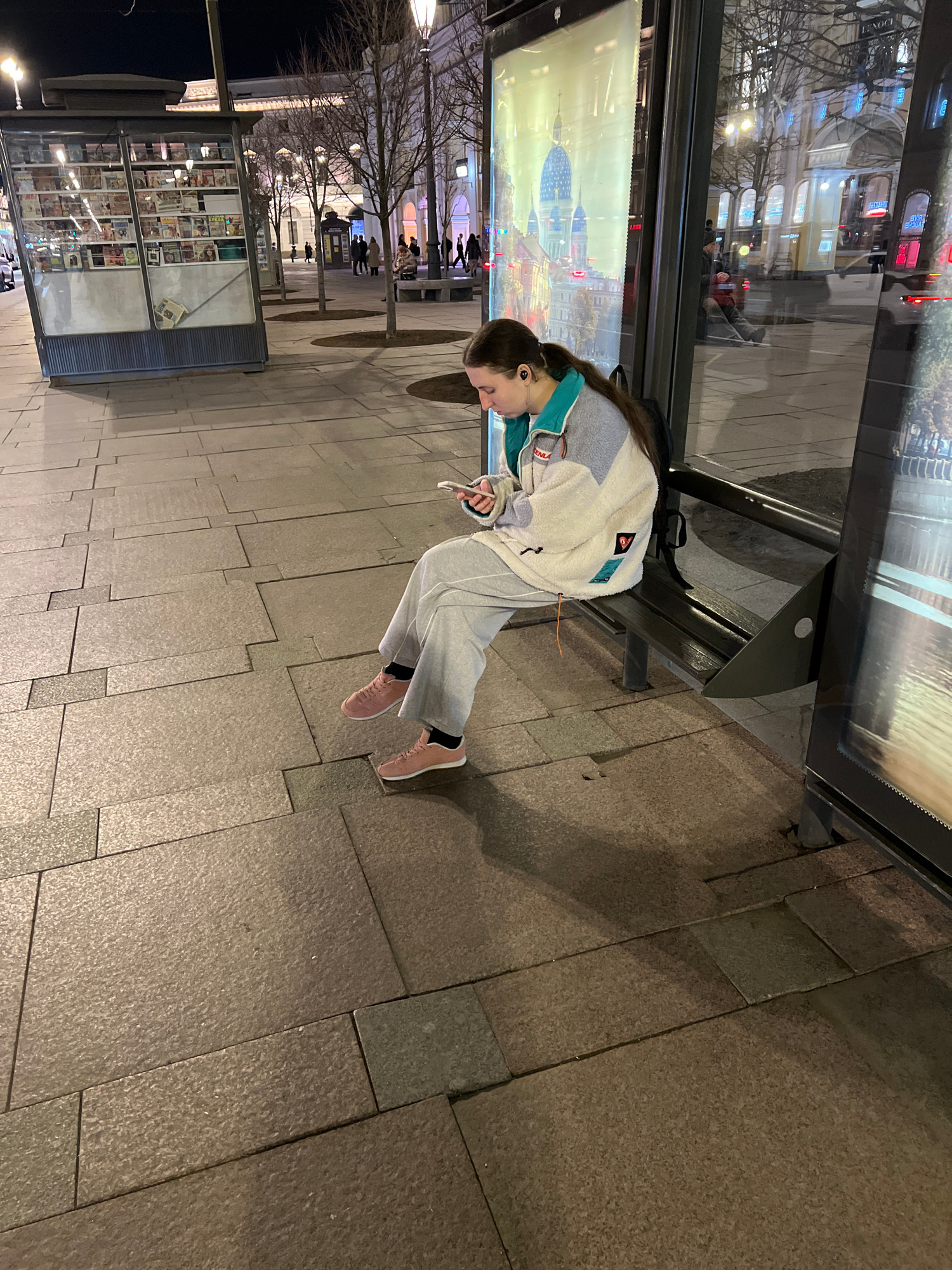 A young woman in a white and gray jacket and gray sweatpants, wearing pink sneakers, sits on a bench at a bus stop in Saint Petersburg, Russia. She is looking at her phone. The bus stop has a large diβ¦read more