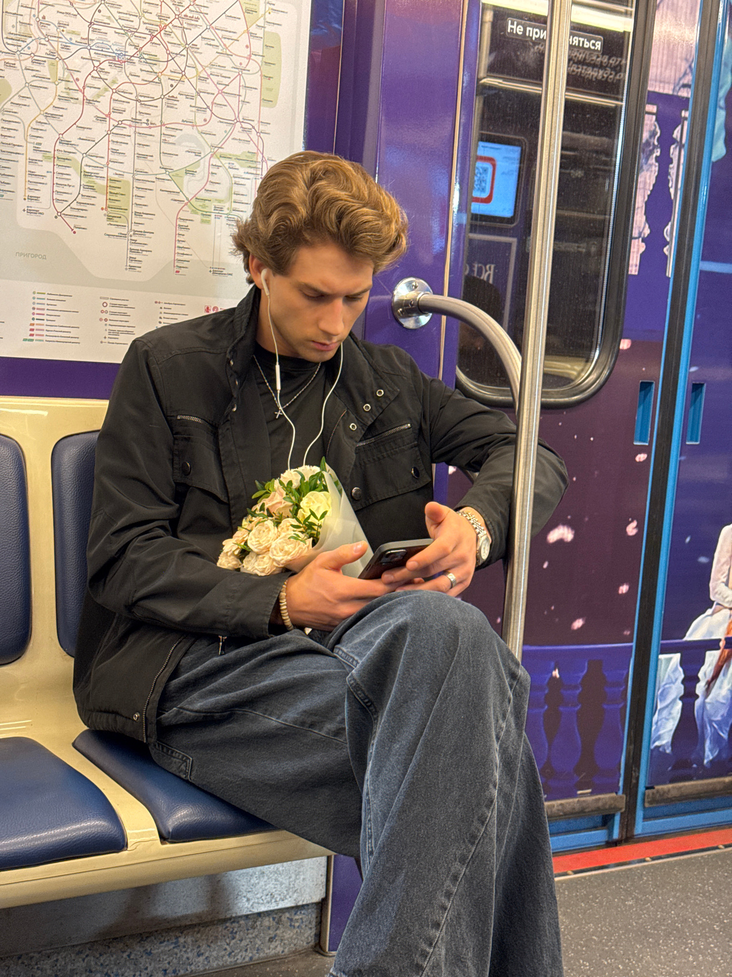 A young man is sitting on a train in Moscow, Russia. He is holding a bouquet of flowers and looking at his phone. He is wearing a black jacket, jeans, and has headphones in. The train car has a purple…read more