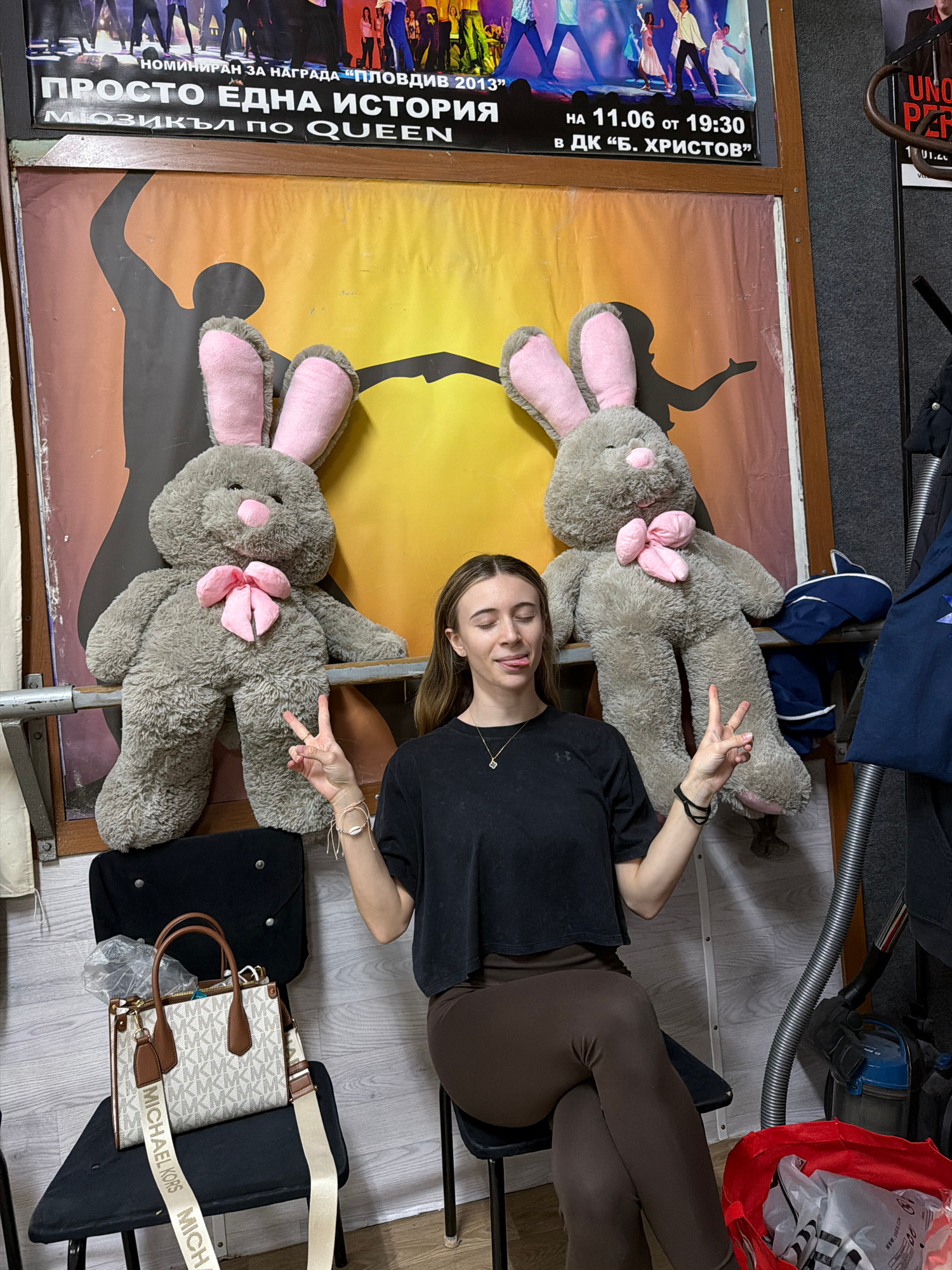 A woman is sitting in a chair in what appears to be a storage room, with two large, gray plush bunny toys beside her. She is wearing a black t-shirt and brown leggings, and she is making a peace sign…read more