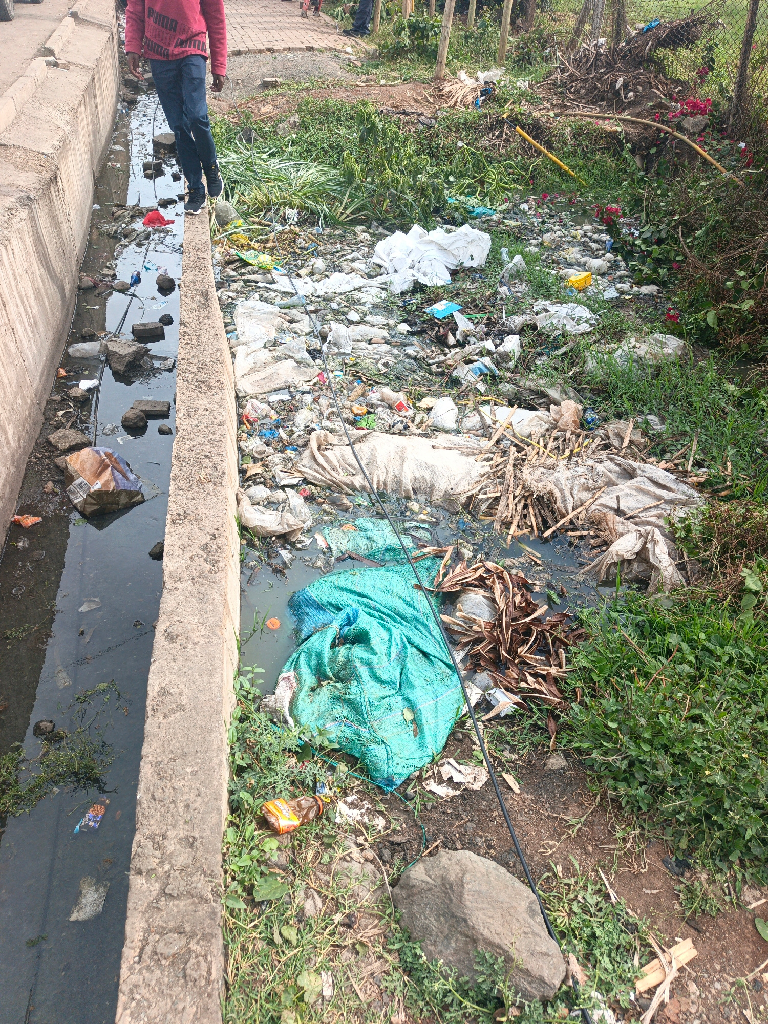 This outdoor image captures a scene of significant environmental pollution in what appears to be an urban or peri-urban area, consistent with Nairobi, Kenya. In the foreground, a concrete-lined drain…read more